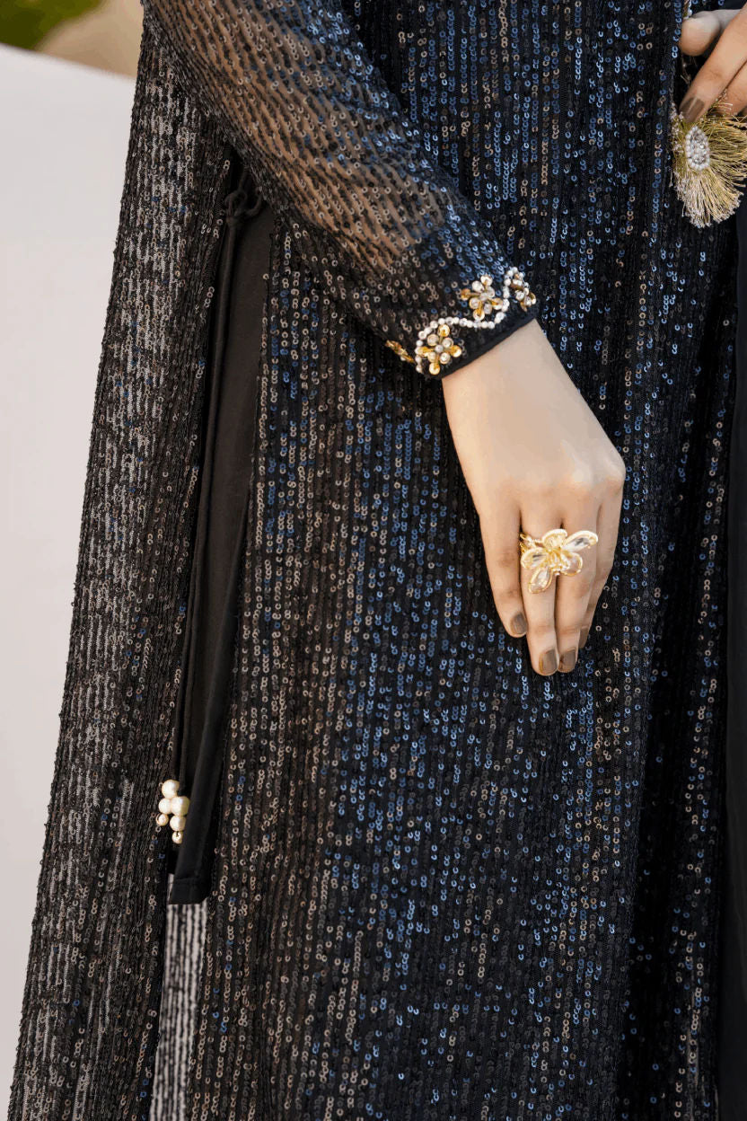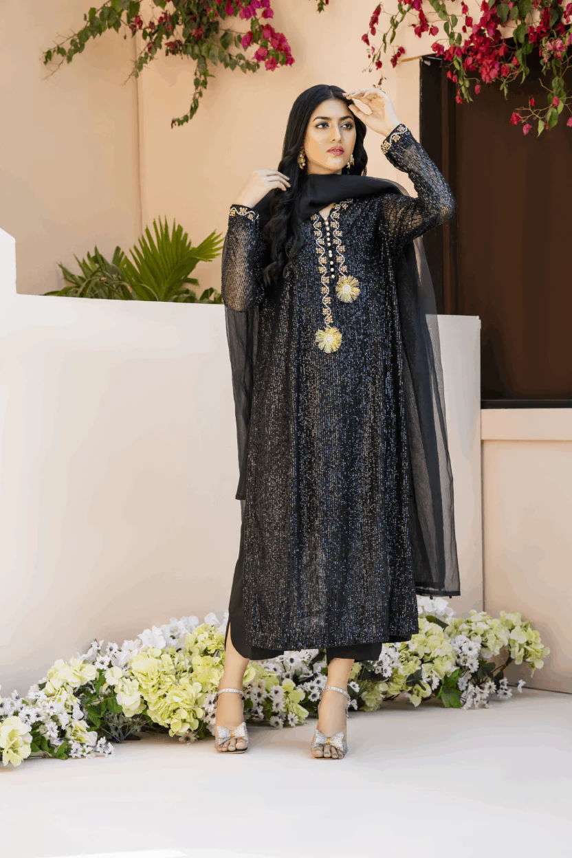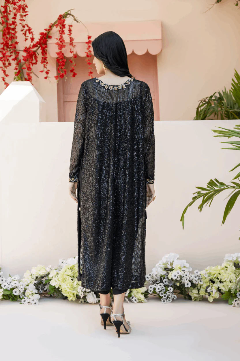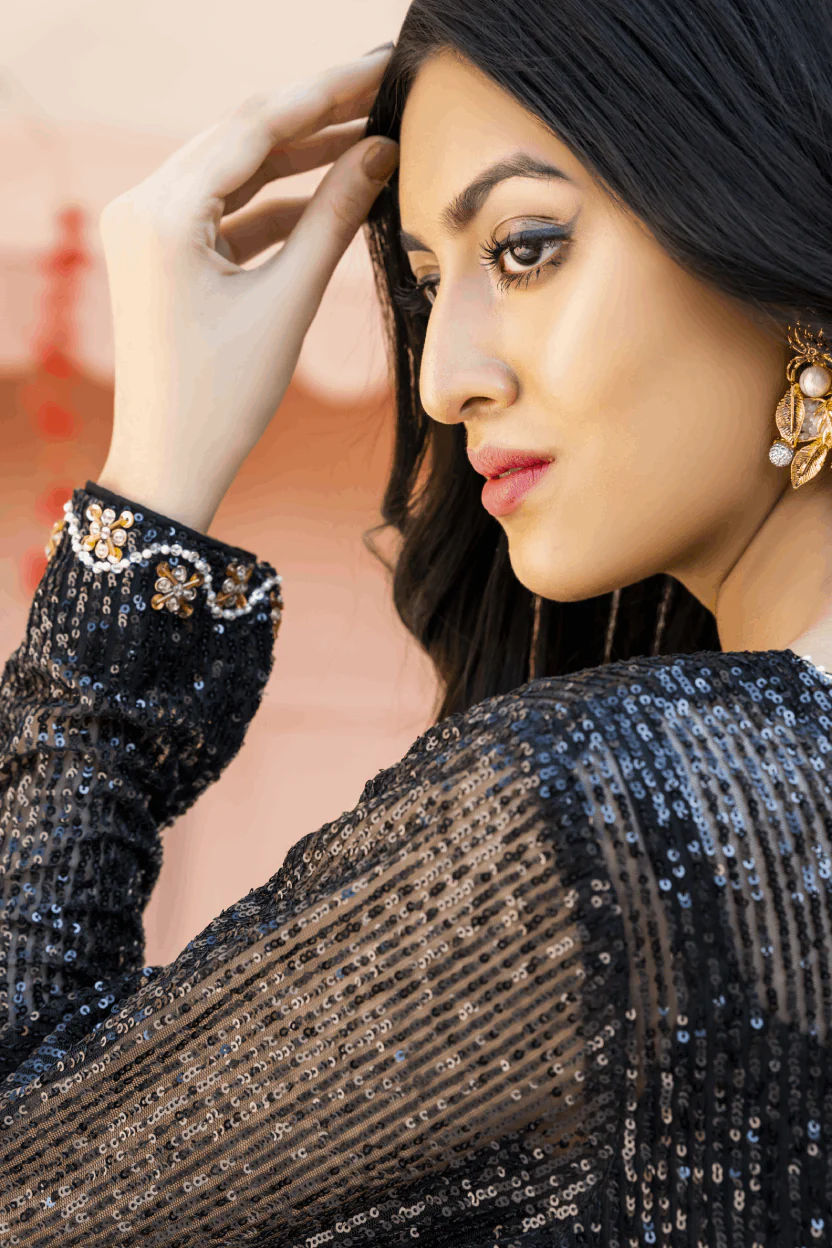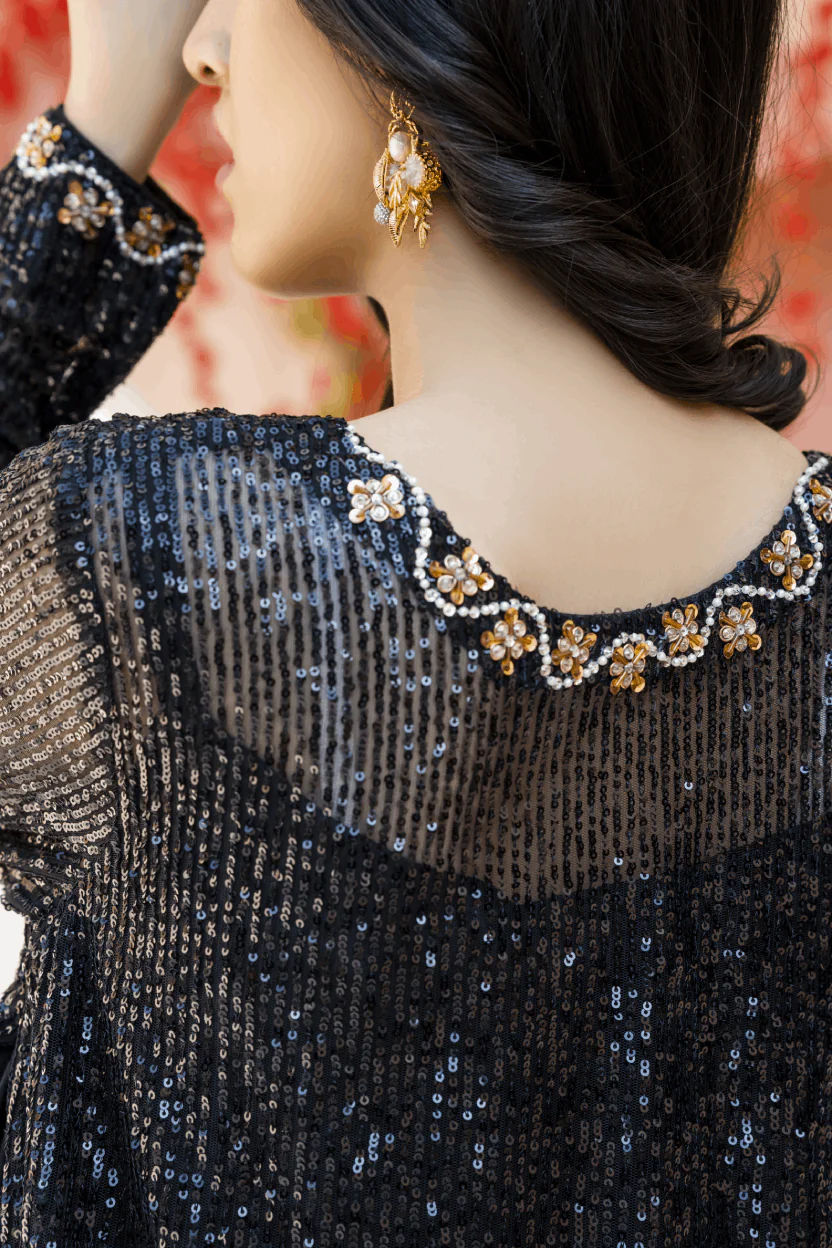 Black sequin shirt with head embroidery. A line side slit shirt adorned with pearls & sequins embroidery all over. Paired up with a bamboo raw silk culotte and slip. A perfect chic look for this festive season.