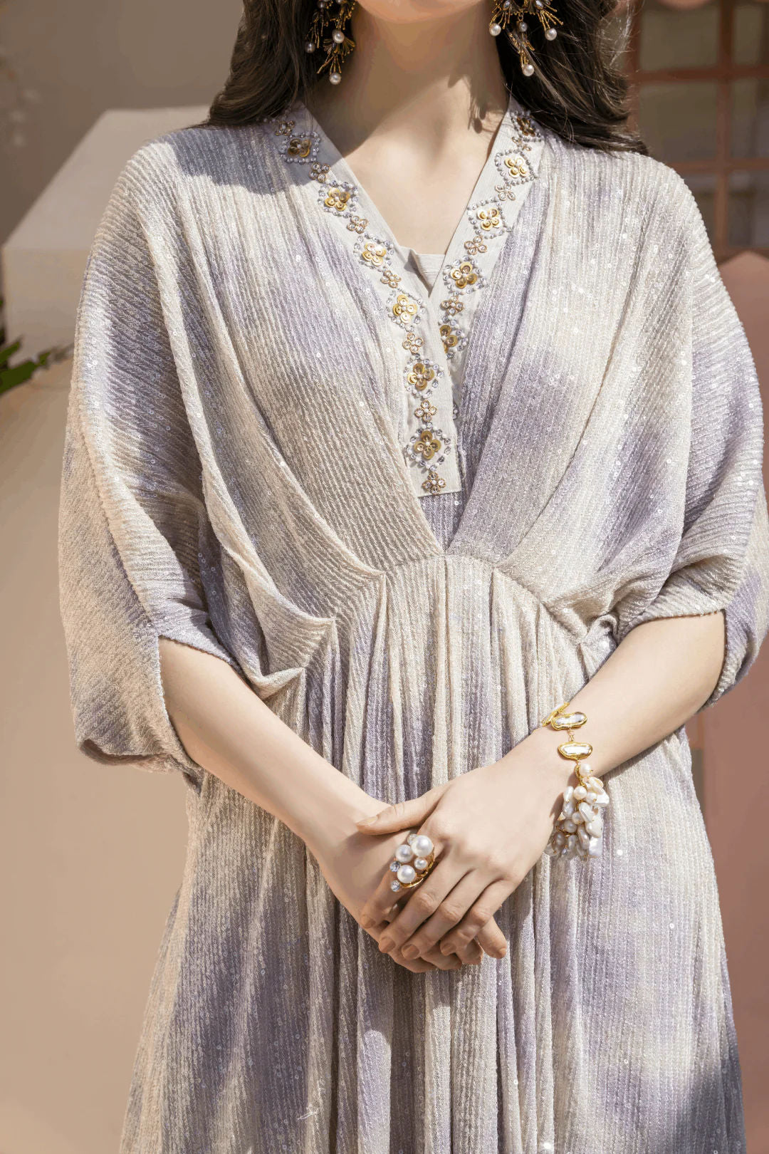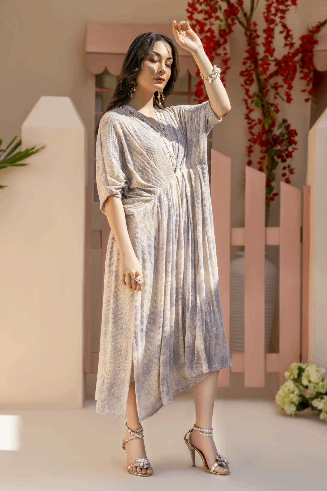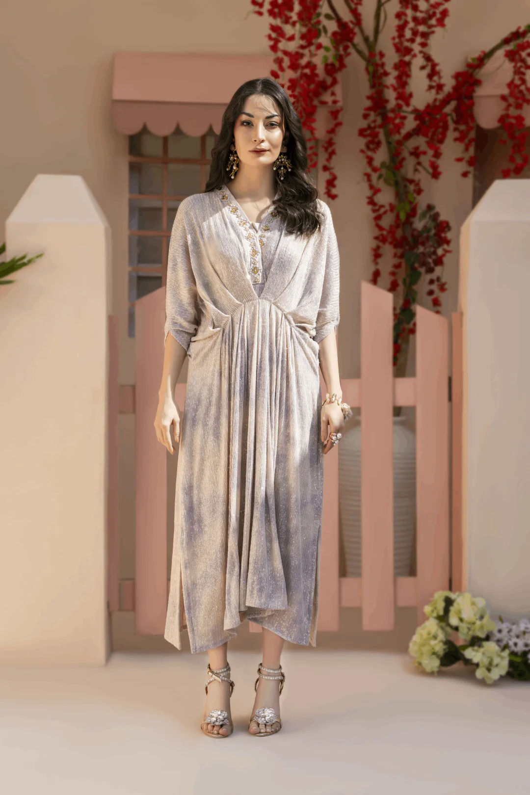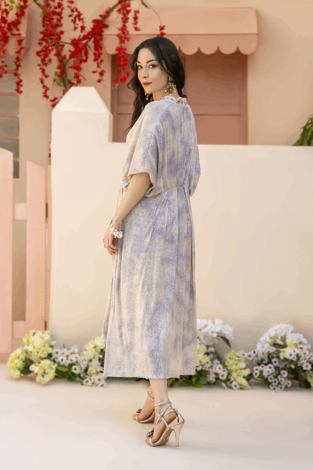 Pastels tie dye sequins net kaftan with mint and lavender accents. Kaftan is adorned with tile, sequins, and pearls' hand embroidery neckline. Paired up with a long underslip. A perfect chic look for this festive season.