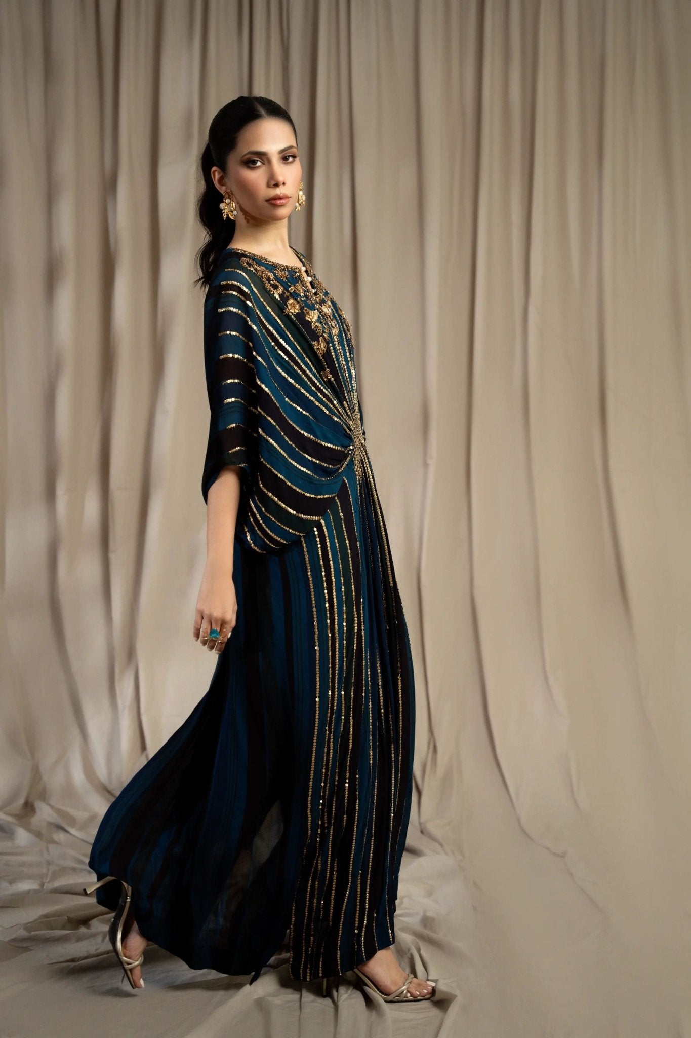 LIA - Festive Formal: The ensemble features a digital printed kaftan exquisitely adorned with zardozi and sequins embroidery all over. Pearl and bead finishings. Paired with Bamboo raw silk straight pants and under shirt. Exudes an air of effortless elegance, making it the perfect choice for any occasion.