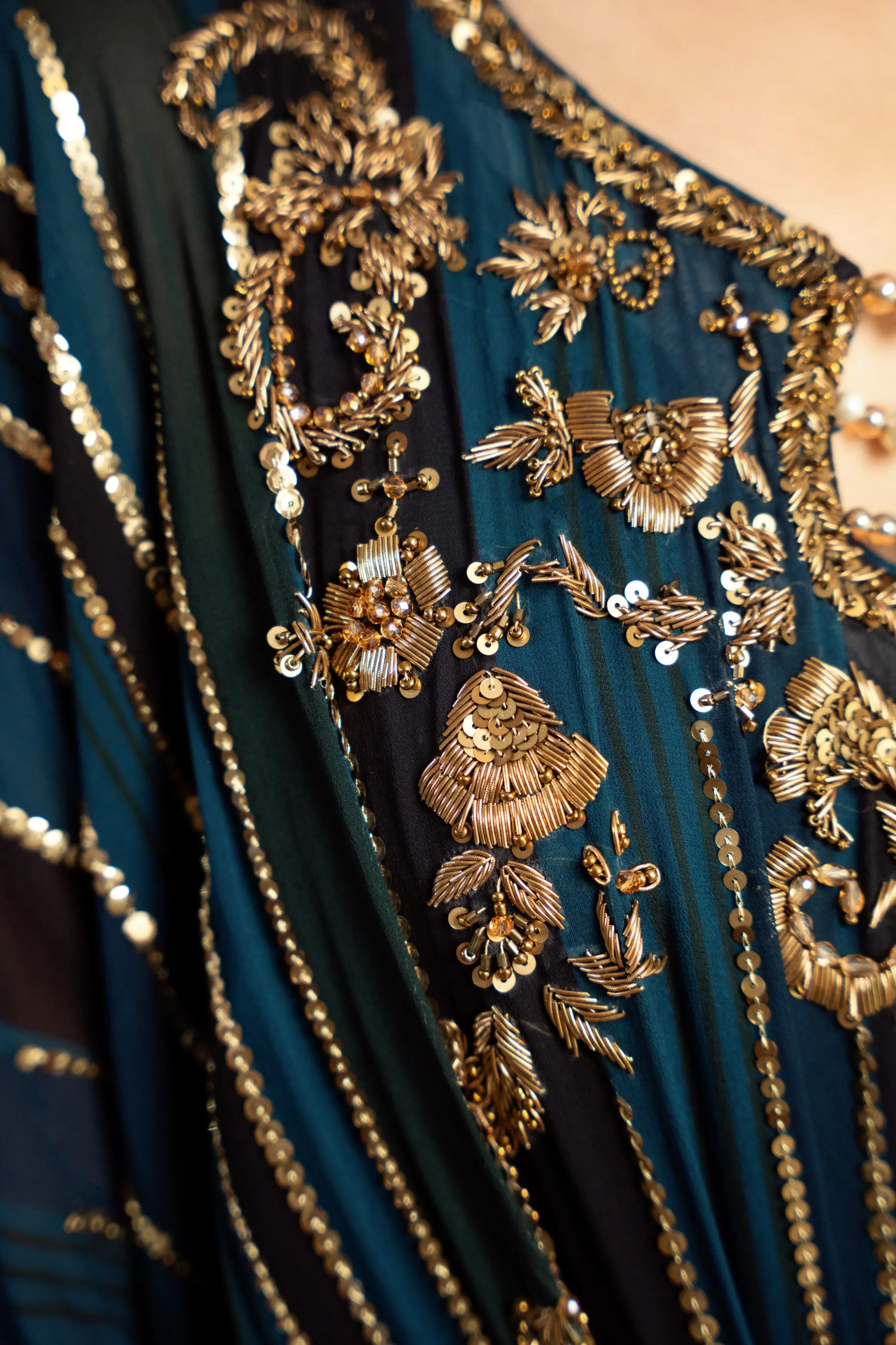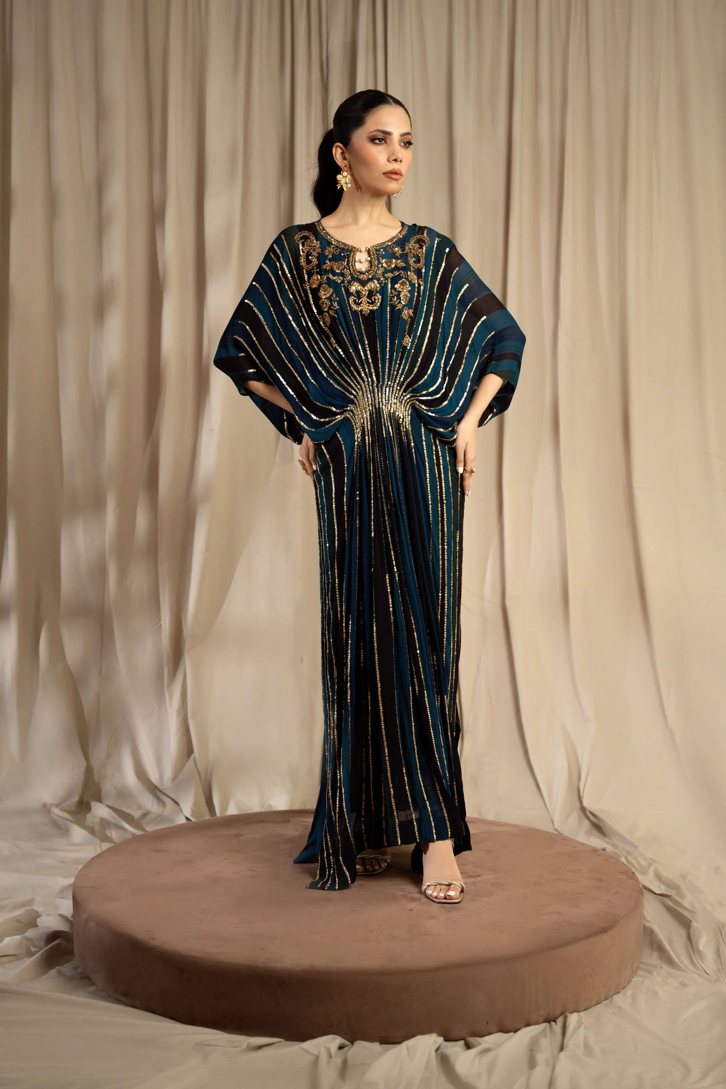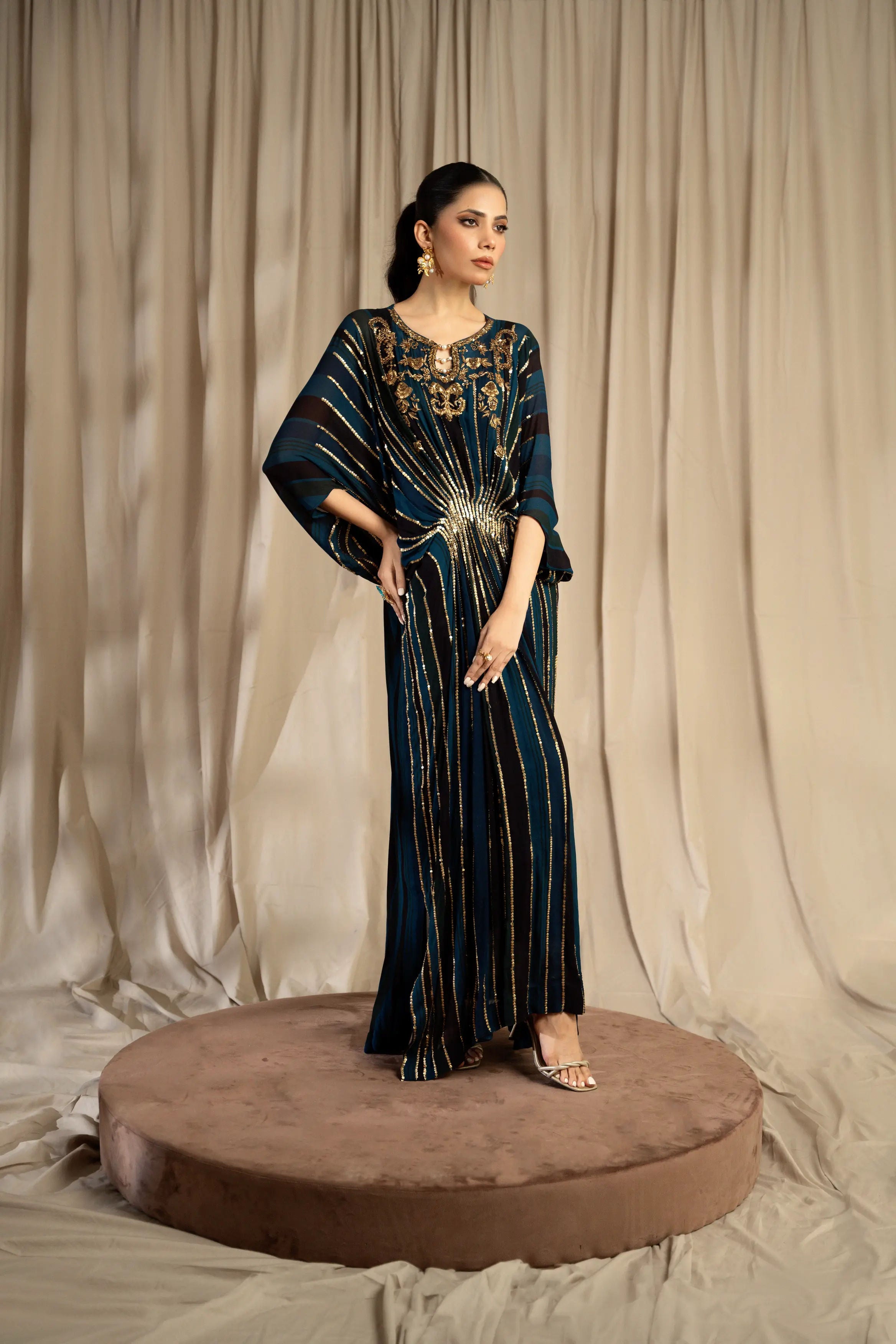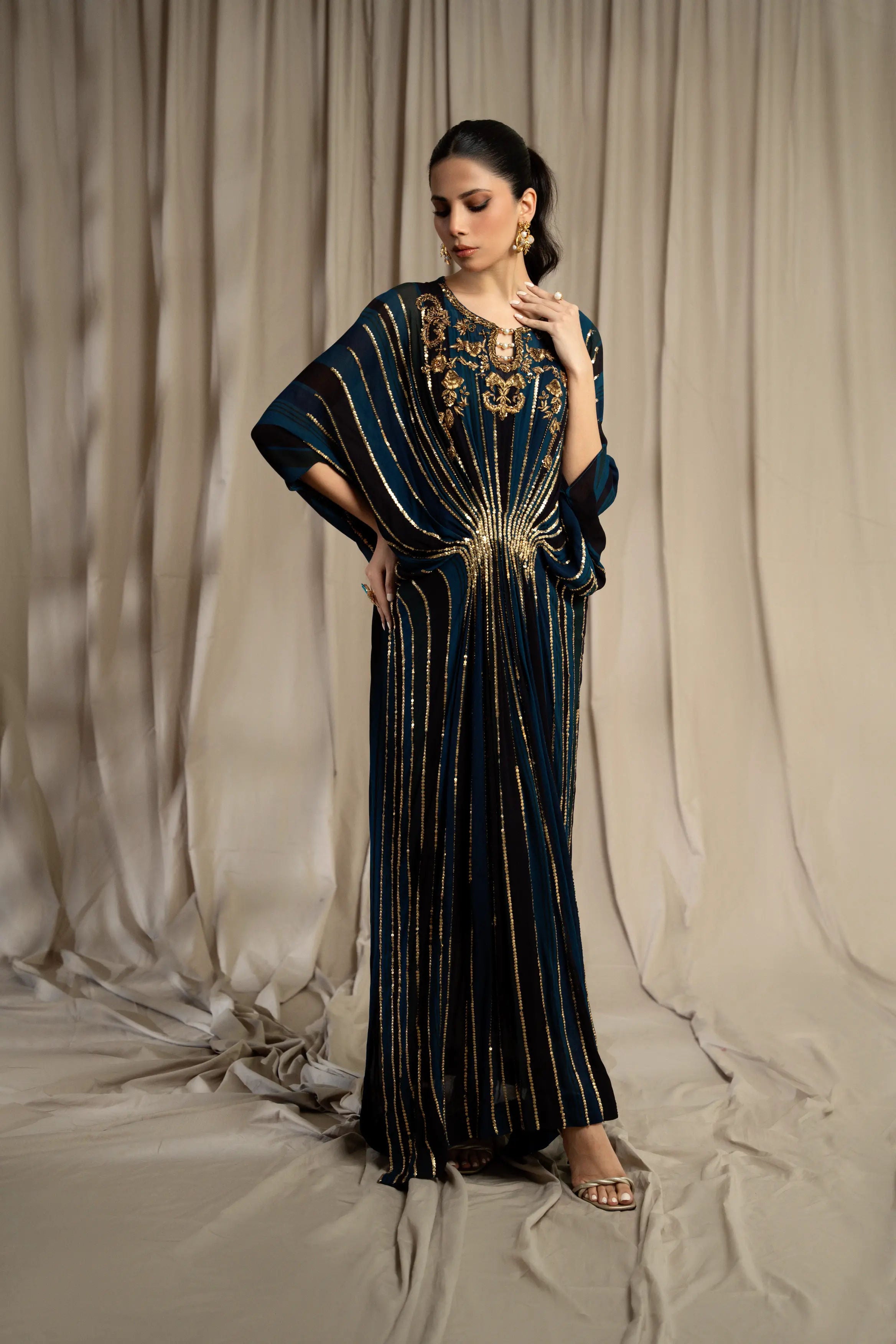 LIA - Festive Formal: The ensemble features a digital printed kaftan exquisitely adorned with zardozi and sequins embroidery all over. Pearl and bead finishings. Paired with Bamboo raw silk straight pants and under shirt. Exudes an air of effortless elegance, making it the perfect choice for any occasion.