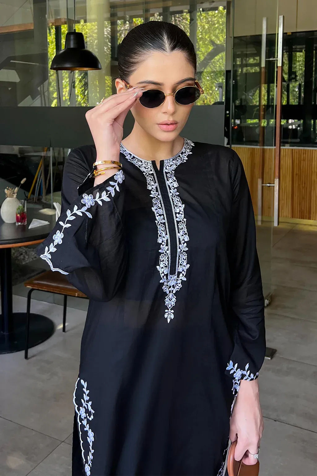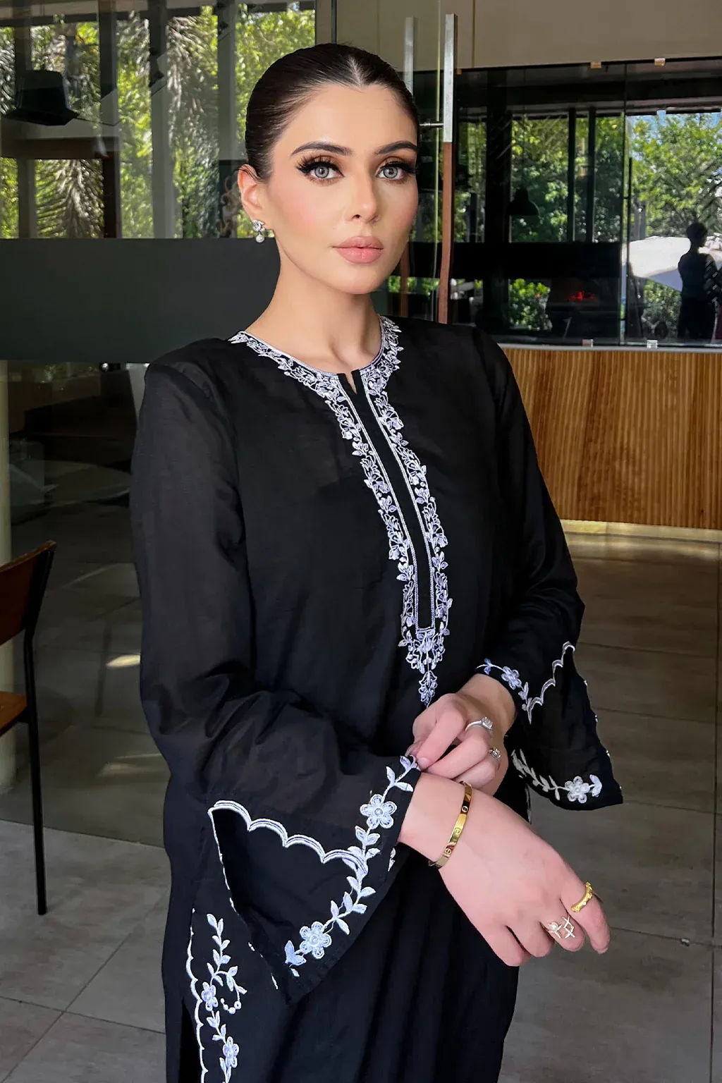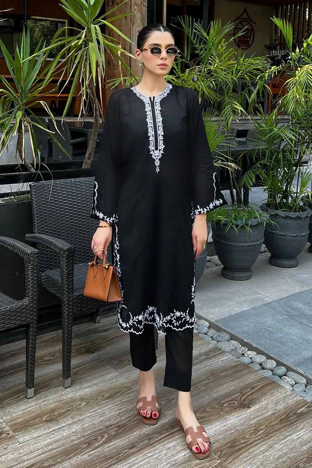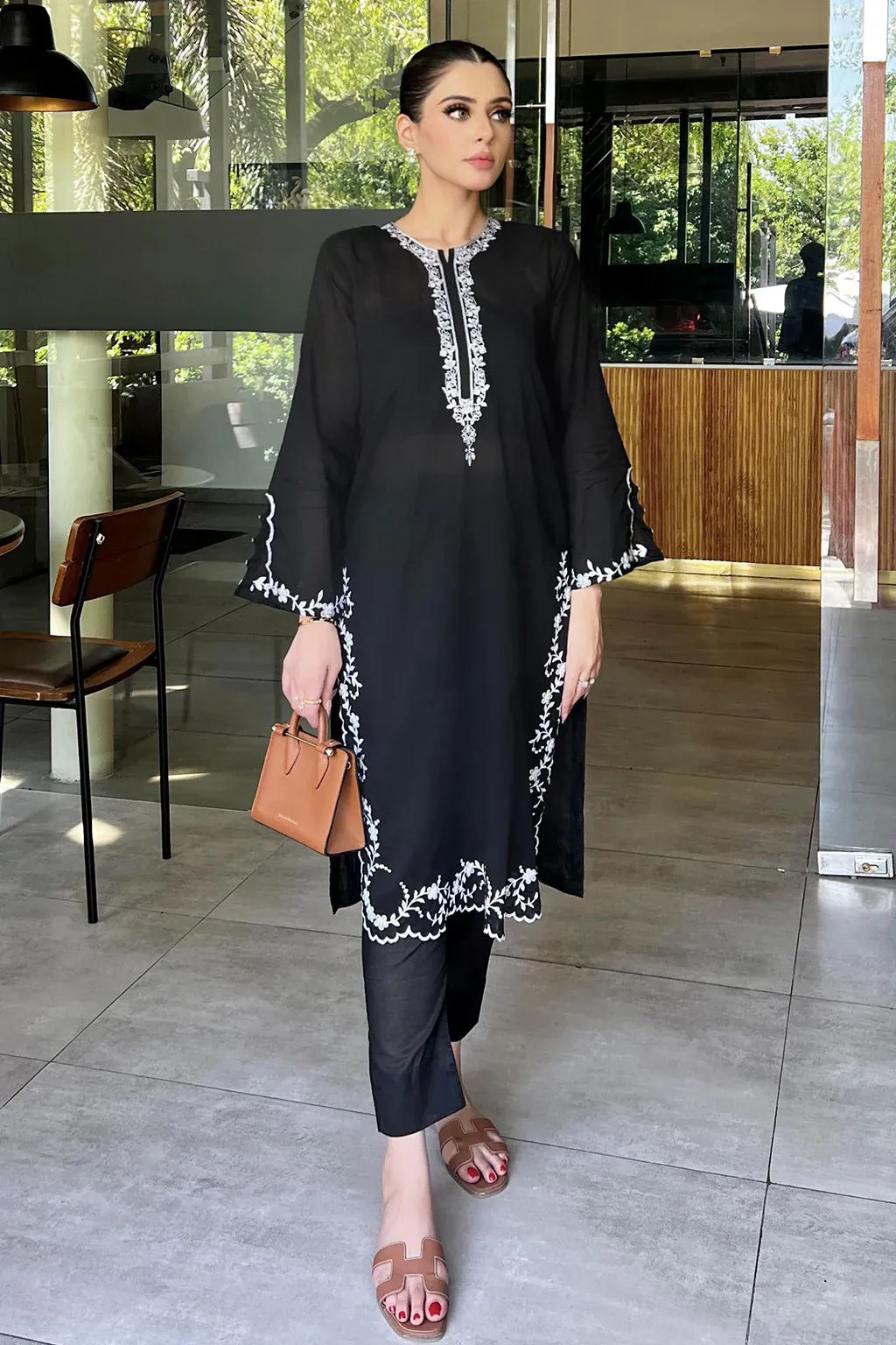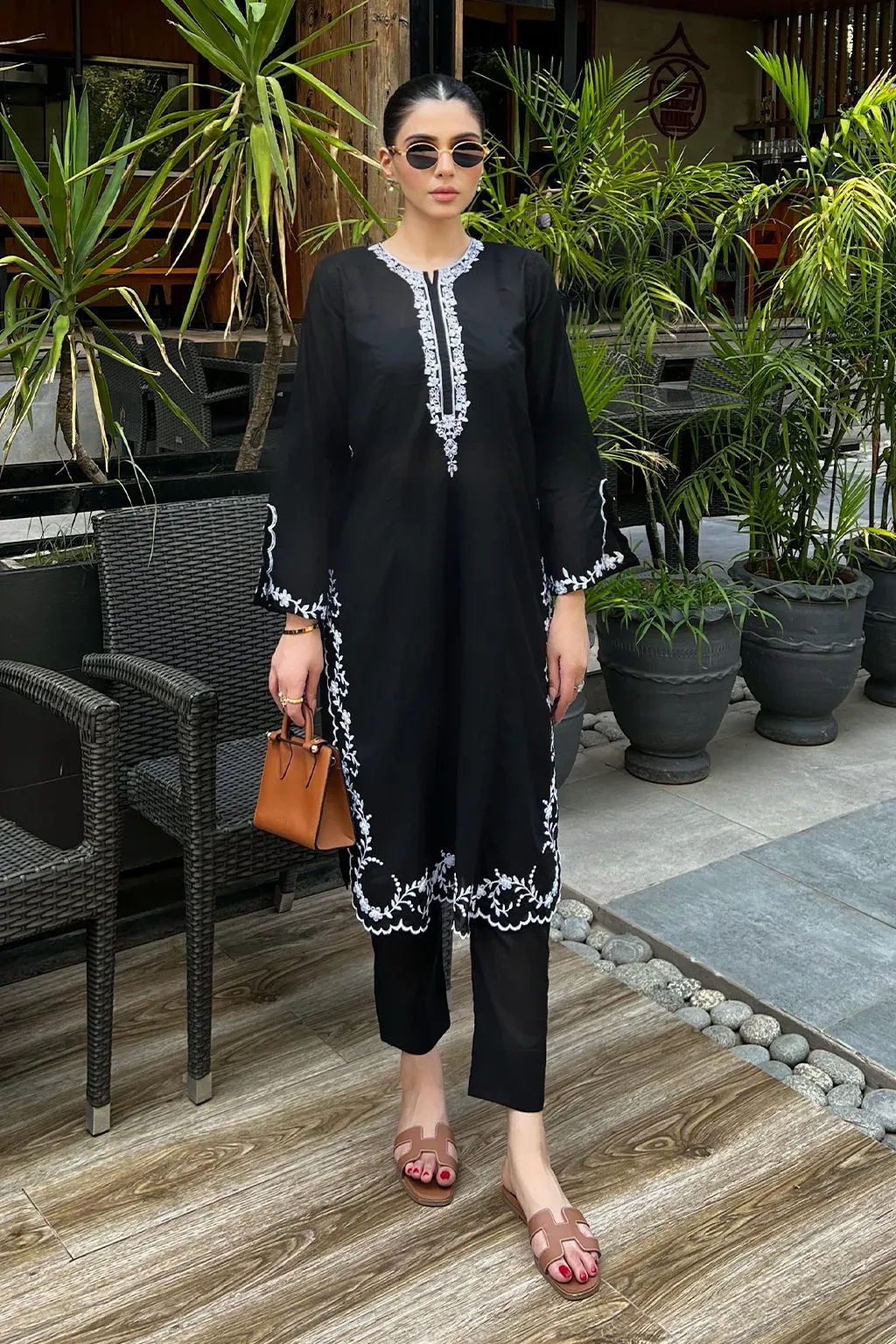The Kyraa Noir black embroidered suit is a perfect blend of elegance and sophistication. Designed with intricate white floral embroidery and scalloped borders, this stitched 2-piece Pakistani dress is a timeless wardrobe staple. Crafted from premium breathable lawn fabric, it offers style and comfort for casual gatherings or formal events. The smart-fit plain trousers complete the look effortlessly.