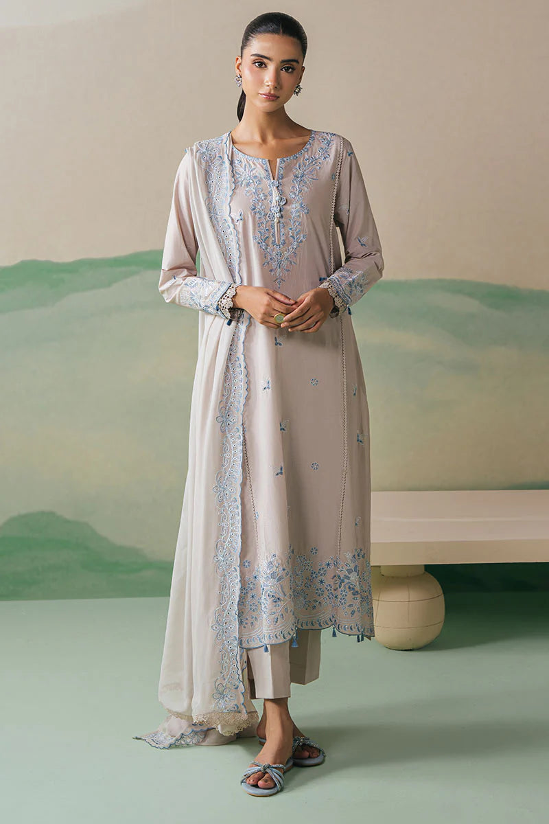 This Dusty Frost 3PC Lawn Embroidered Suit features a finely embroidered lawn fabric on the front and sleeves, complemented by a dyed back for subtle contrast. The shirt includes a delicately embroidered neckline, enhancing its refined appeal. Paired with a cambric dyed trouser, the ensemble ensures comfort and style. Completing the set is a chiffon dupatta adorned with intricate embroidery, perfect for elevating your traditional wardrobe with expert craftsmanship.