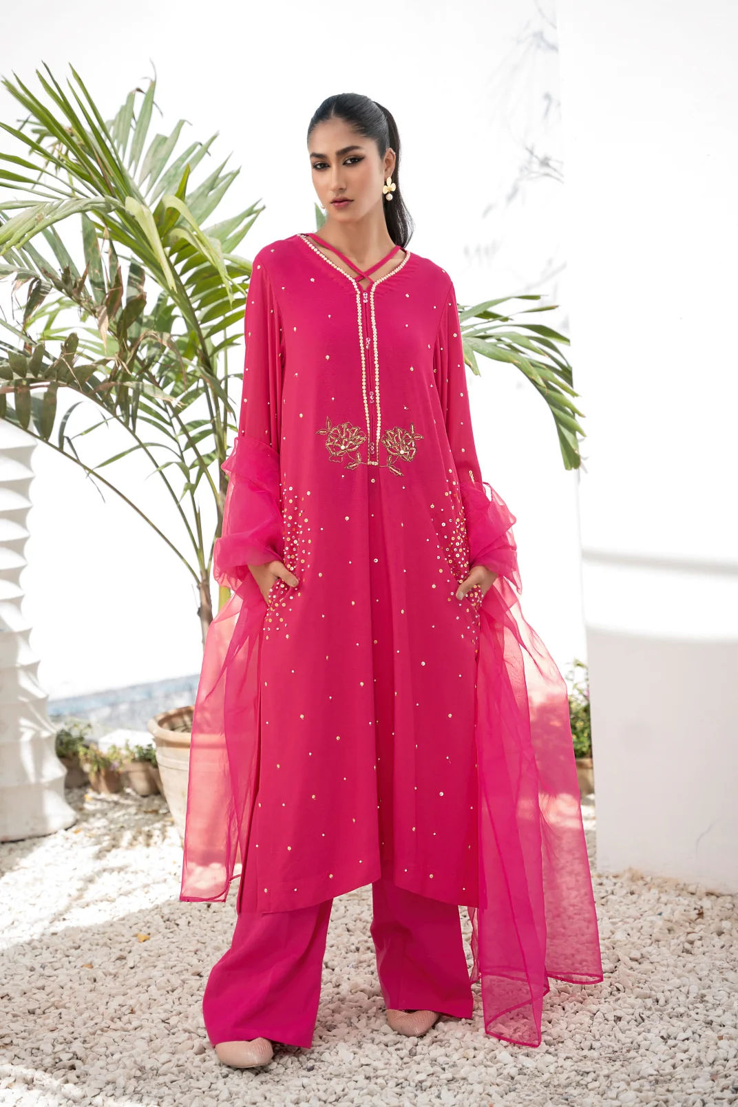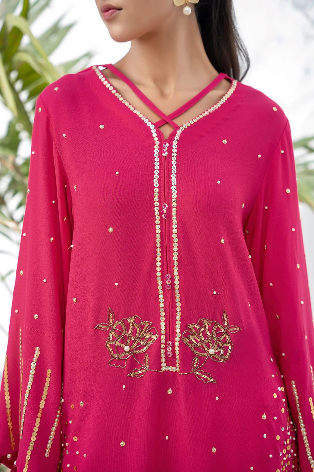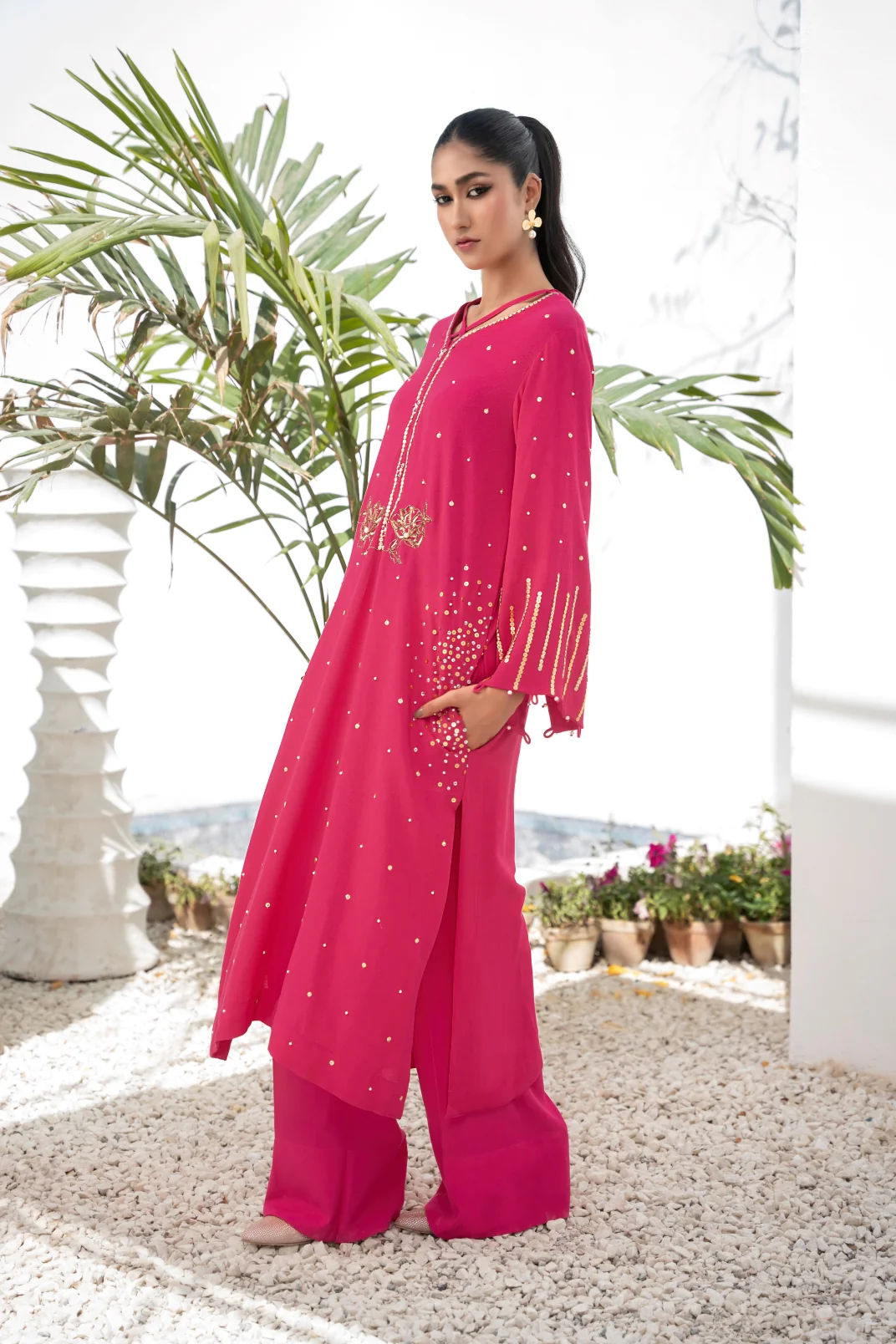 Melia'24: The ensemble features fuchsia pink pure crepe georgette long tunic with plain organza dupatta. Tunic embellished with sequins bugle beads and crystals hand embroidery all over. Embroidered slit sleeves and pockets. Paired up with matching coloured culottes to create an elegant and classic look.