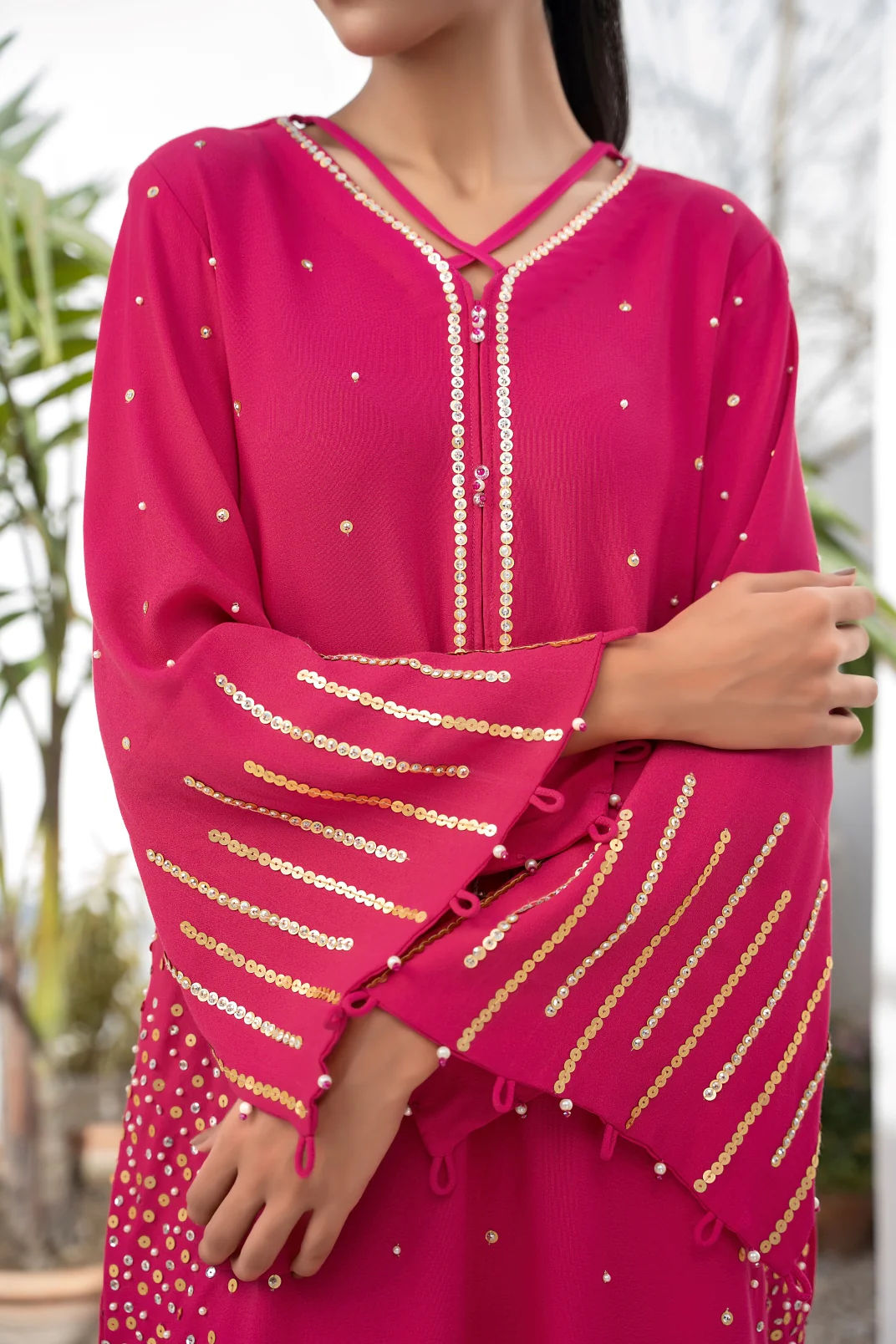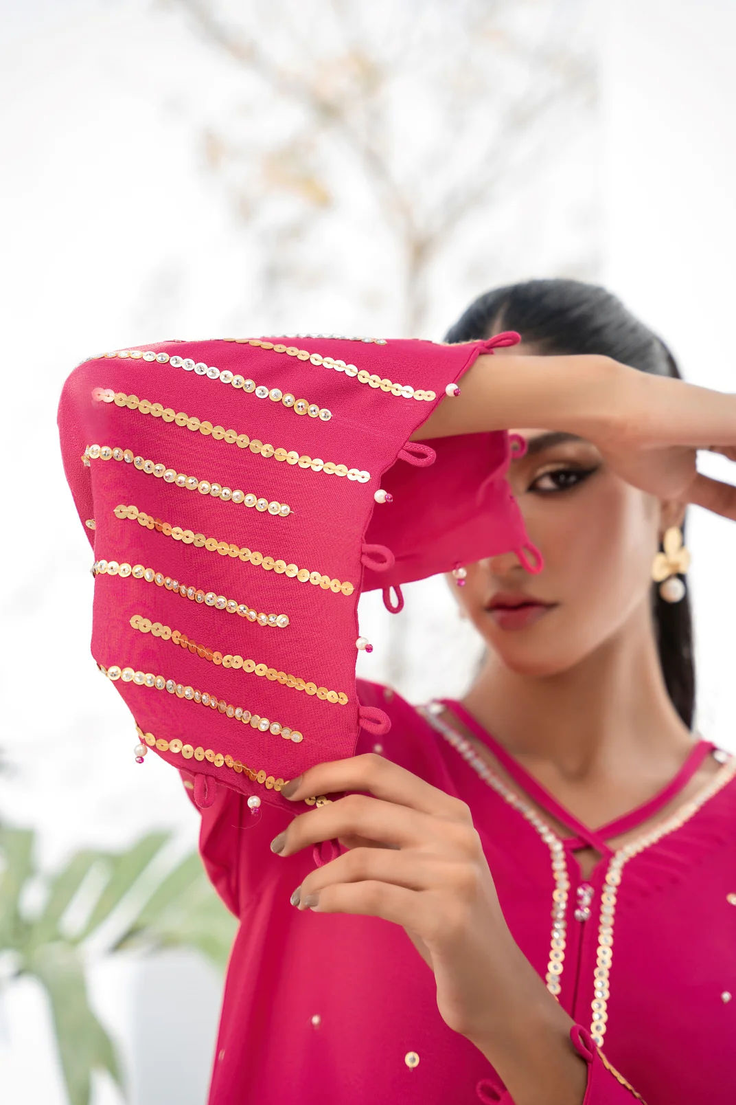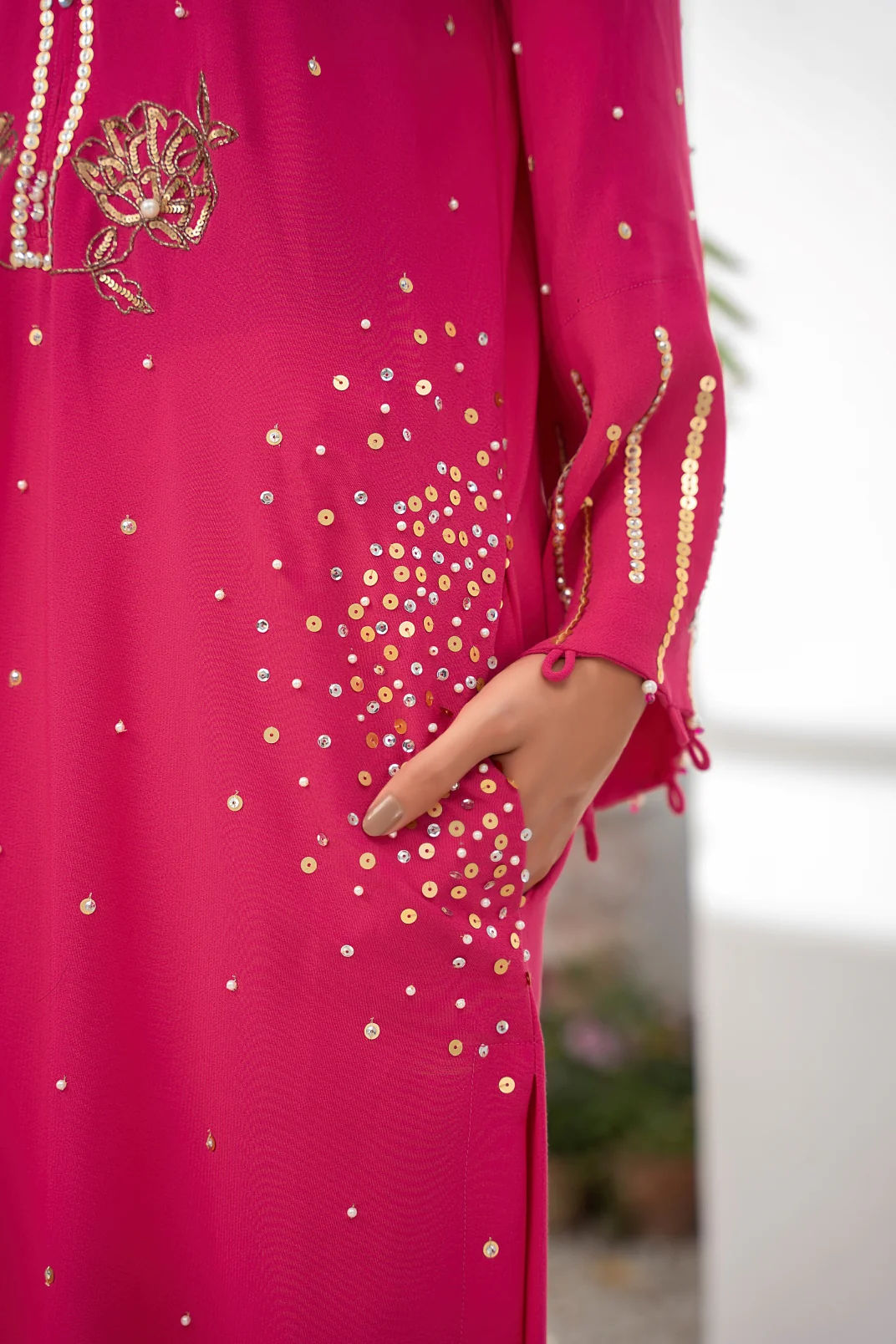 Melia'24: The ensemble features fuchsia pink pure crepe georgette long tunic with plain organza dupatta. Tunic embellished with sequins bugle beads and crystals hand embroidery all over. Embroidered slit sleeves and pockets. Paired up with matching coloured culottes to create an elegant and classic look.