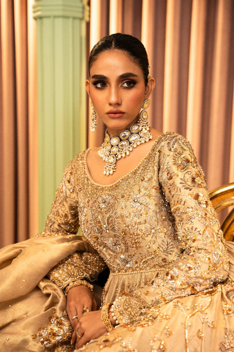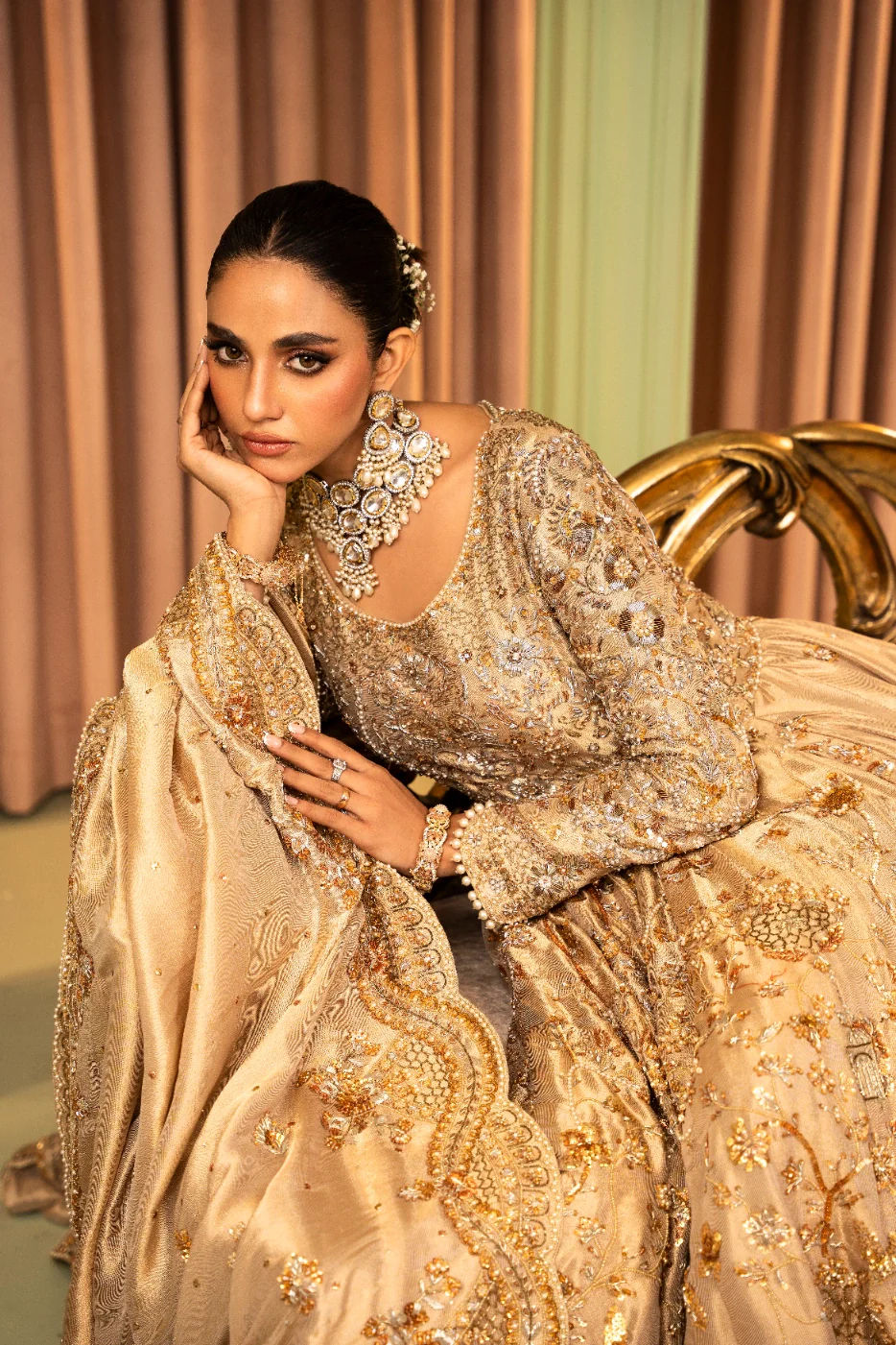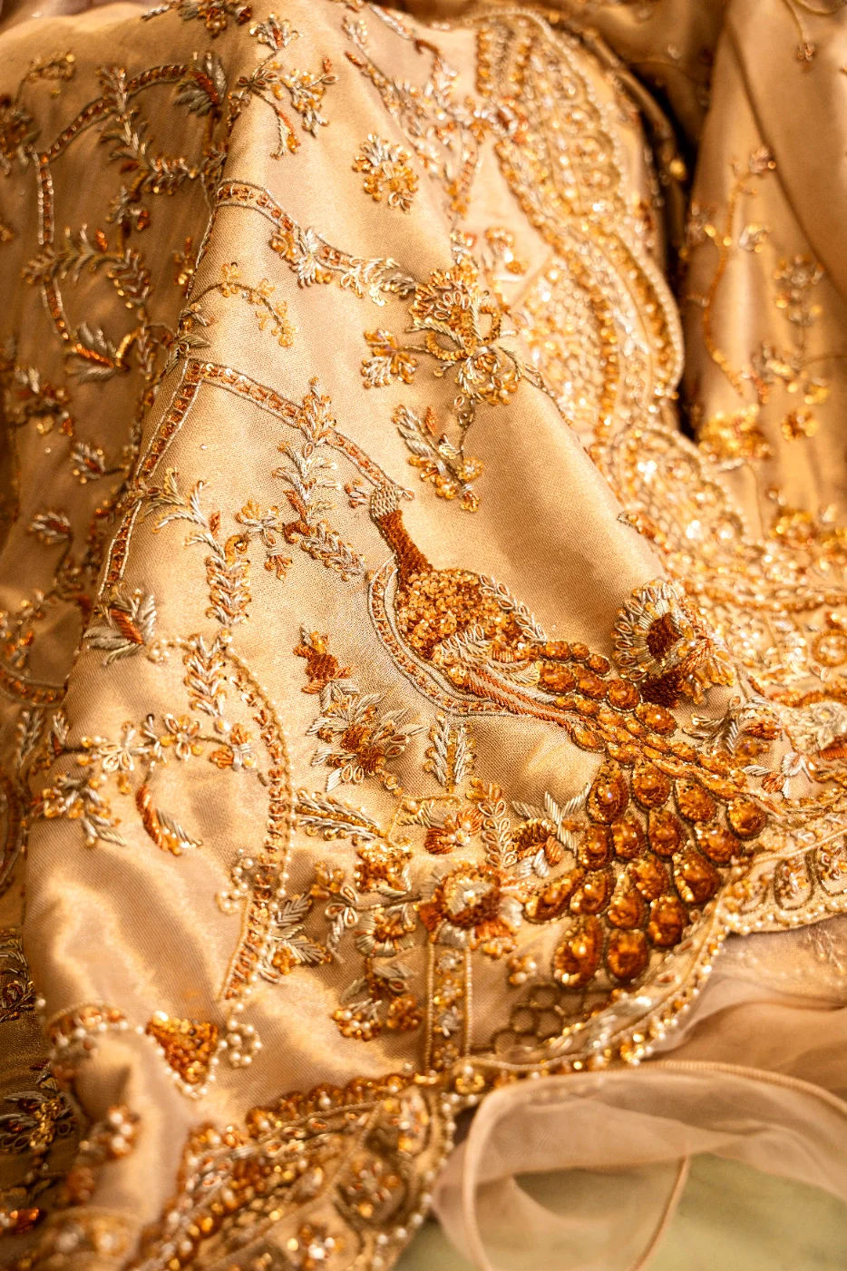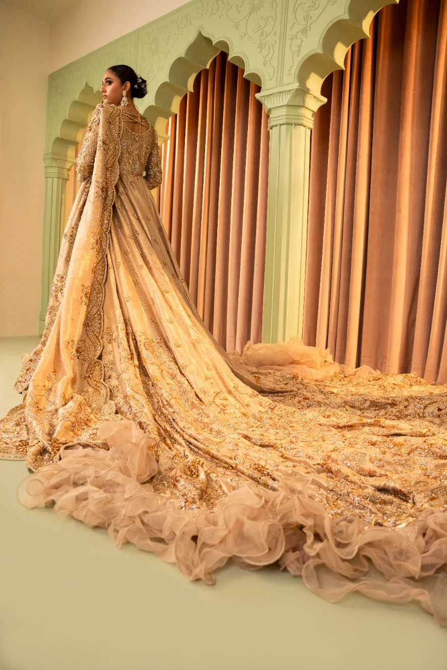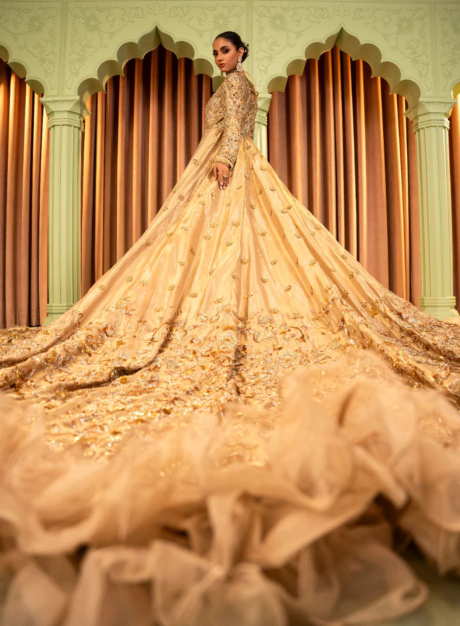 Exude elegance in this metallic gold hued peshwas with cathedral train cut from pure lama net, featuring a scalloped hem and organza swirls to give it an ethereal look. Detailed zardoze work in a silver, copper and gold composition. A lama net dupatta with sprinkled kamdani and zardoze worked borders and fully worked pallus. The composition of the embroidery is inspired by Mughal gardens containing lots of birds specially the peacock. Peacock is the focal point of this whole composition it pops up through out the design.