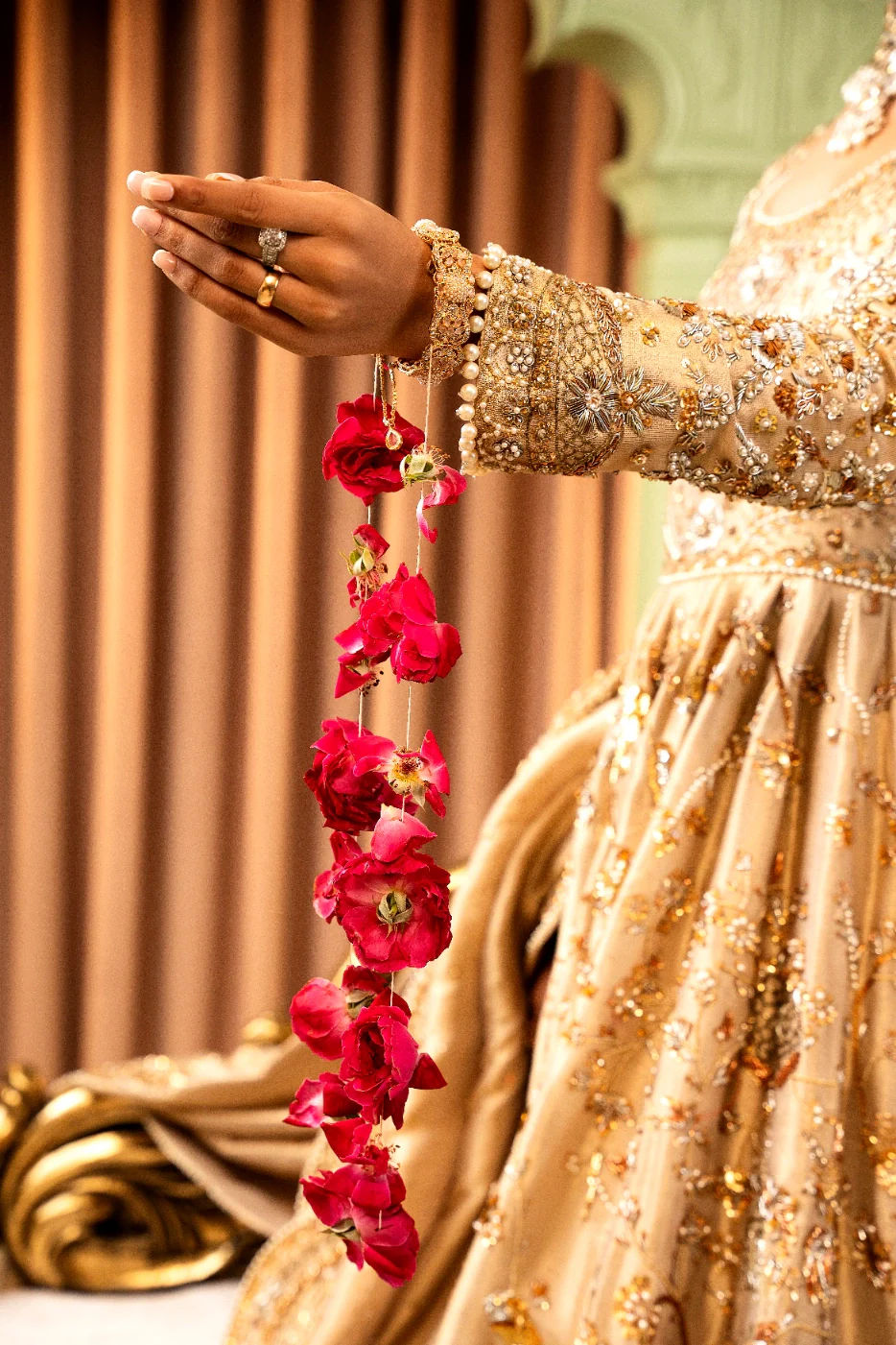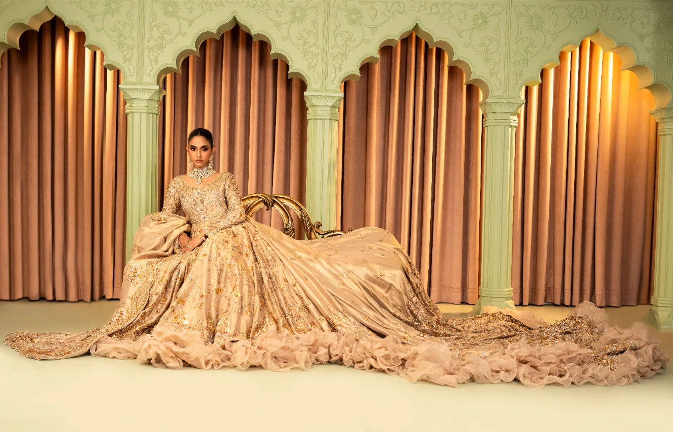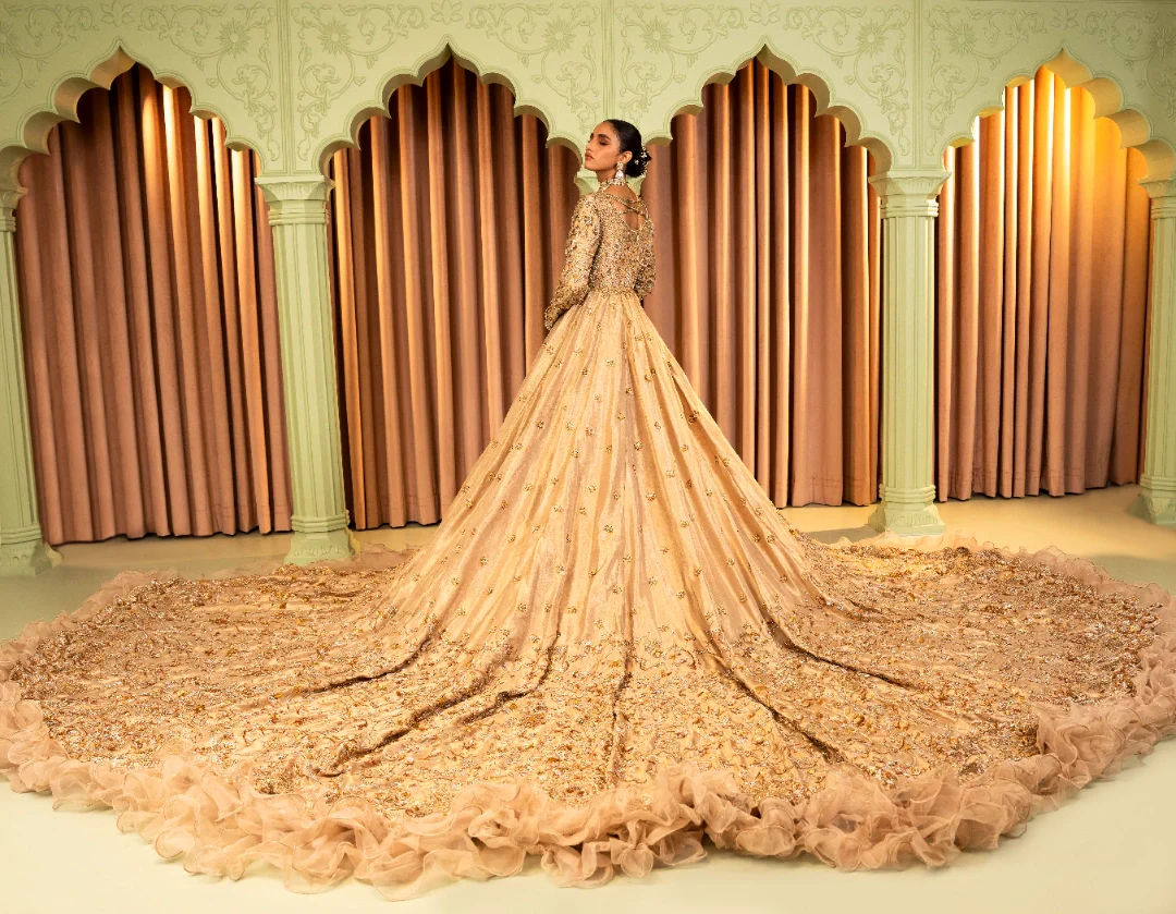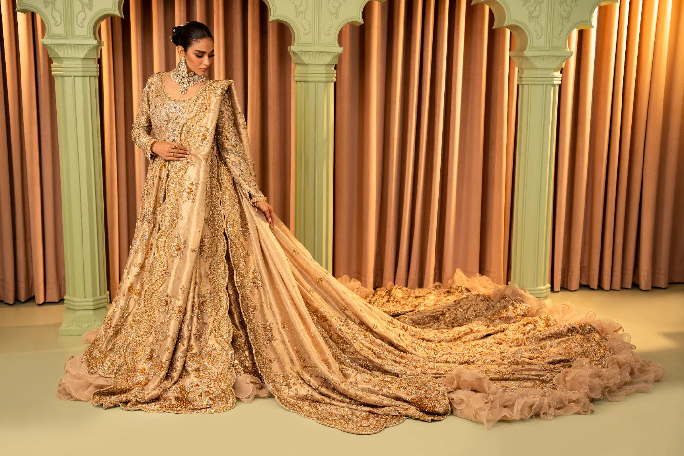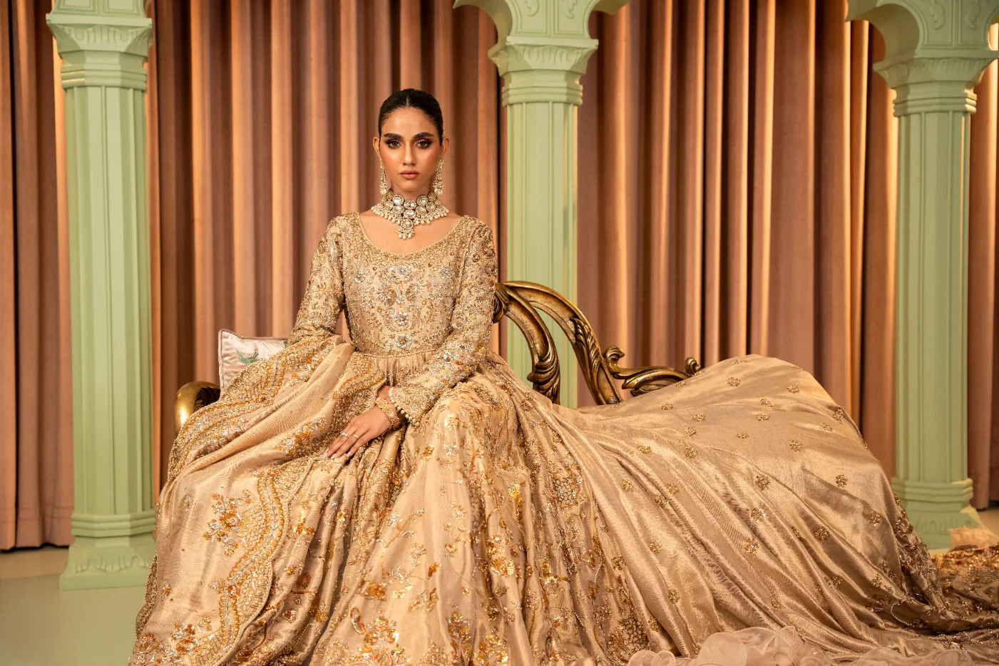 Exude elegance in this metallic gold hued peshwas with cathedral train cut from pure lama net, featuring a scalloped hem and organza swirls to give it an ethereal look. Detailed zardoze work in a silver, copper and gold composition. A lama net dupatta with sprinkled kamdani and zardoze worked borders and fully worked pallus. The composition of the embroidery is inspired by Mughal gardens containing lots of birds specially the peacock. Peacock is the focal point of this whole composition it pops up through out the design.