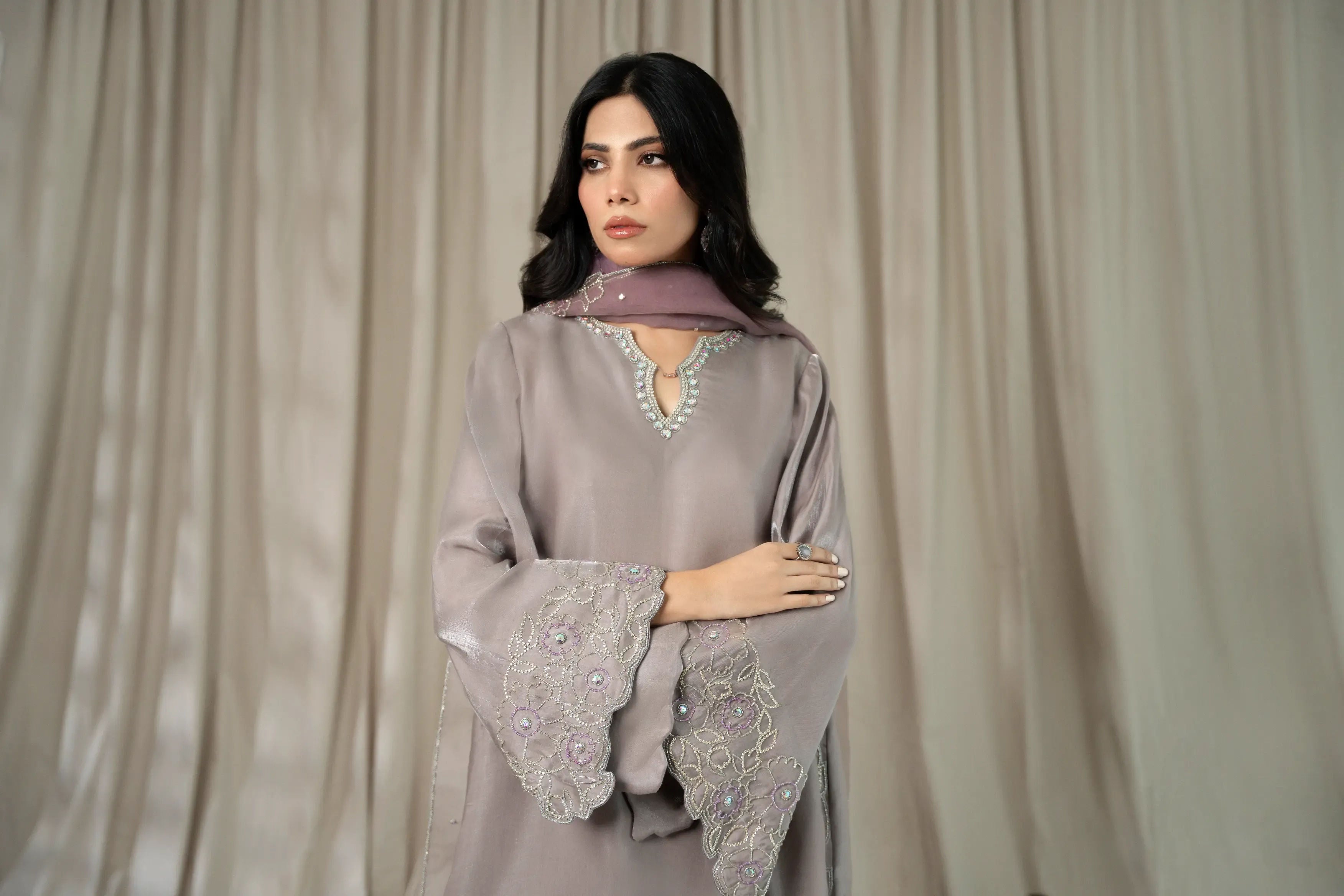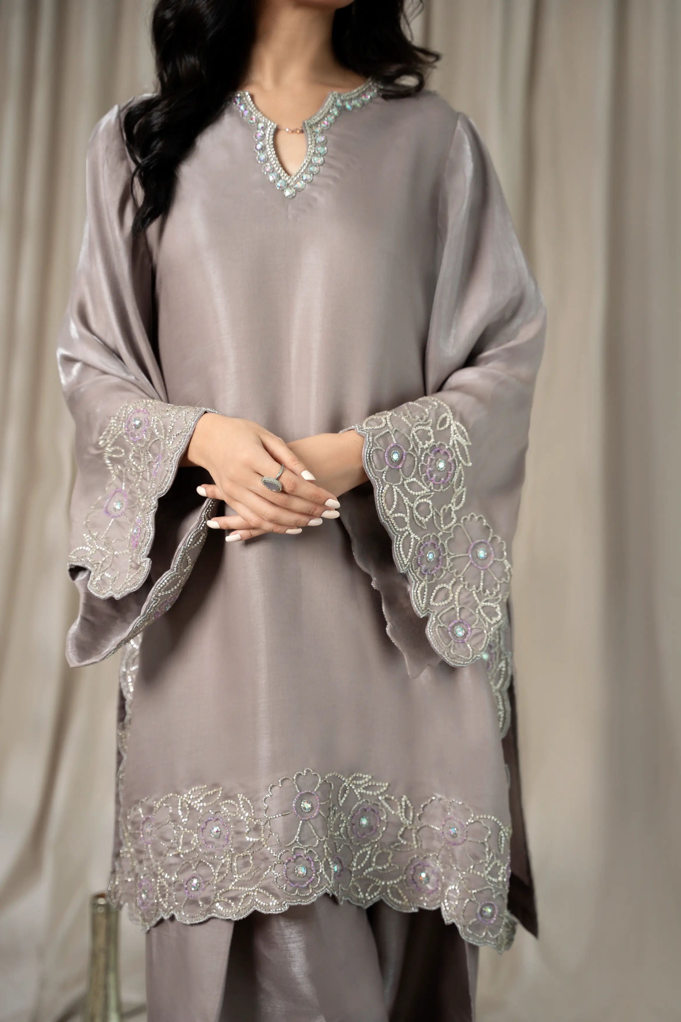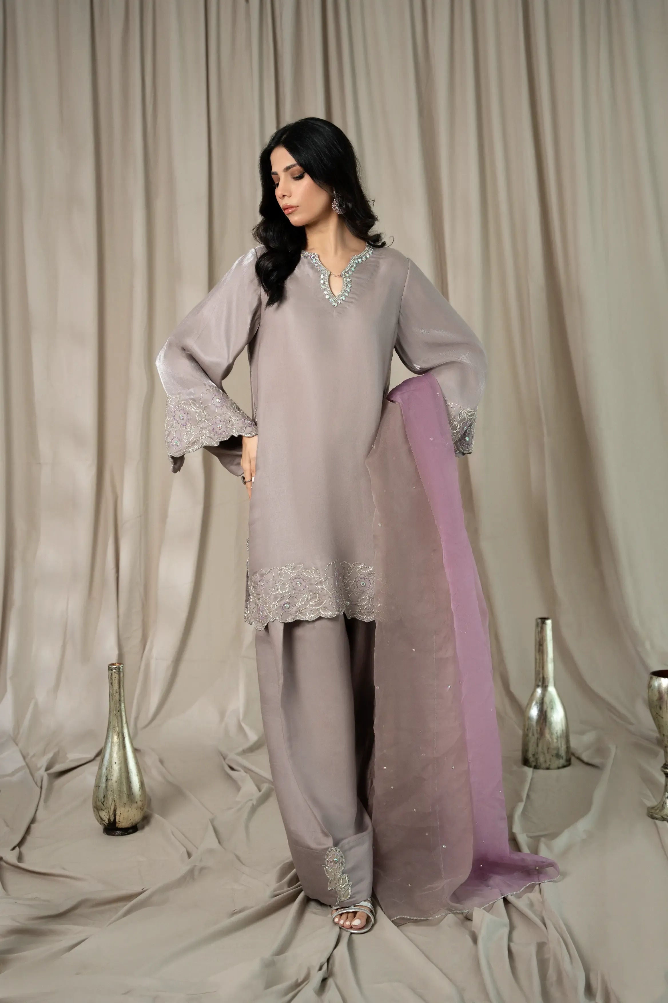 purplish grey sheesha silk short shirt paired with wide leg shalwar. Adorned with floral Swarovski and cutwork embroidery. Half and half organza dupatta embellished with floral Swarovski and cutwork embroidery on edges exudes an air of effortless elegance, making it the perfect choice for any occasion.