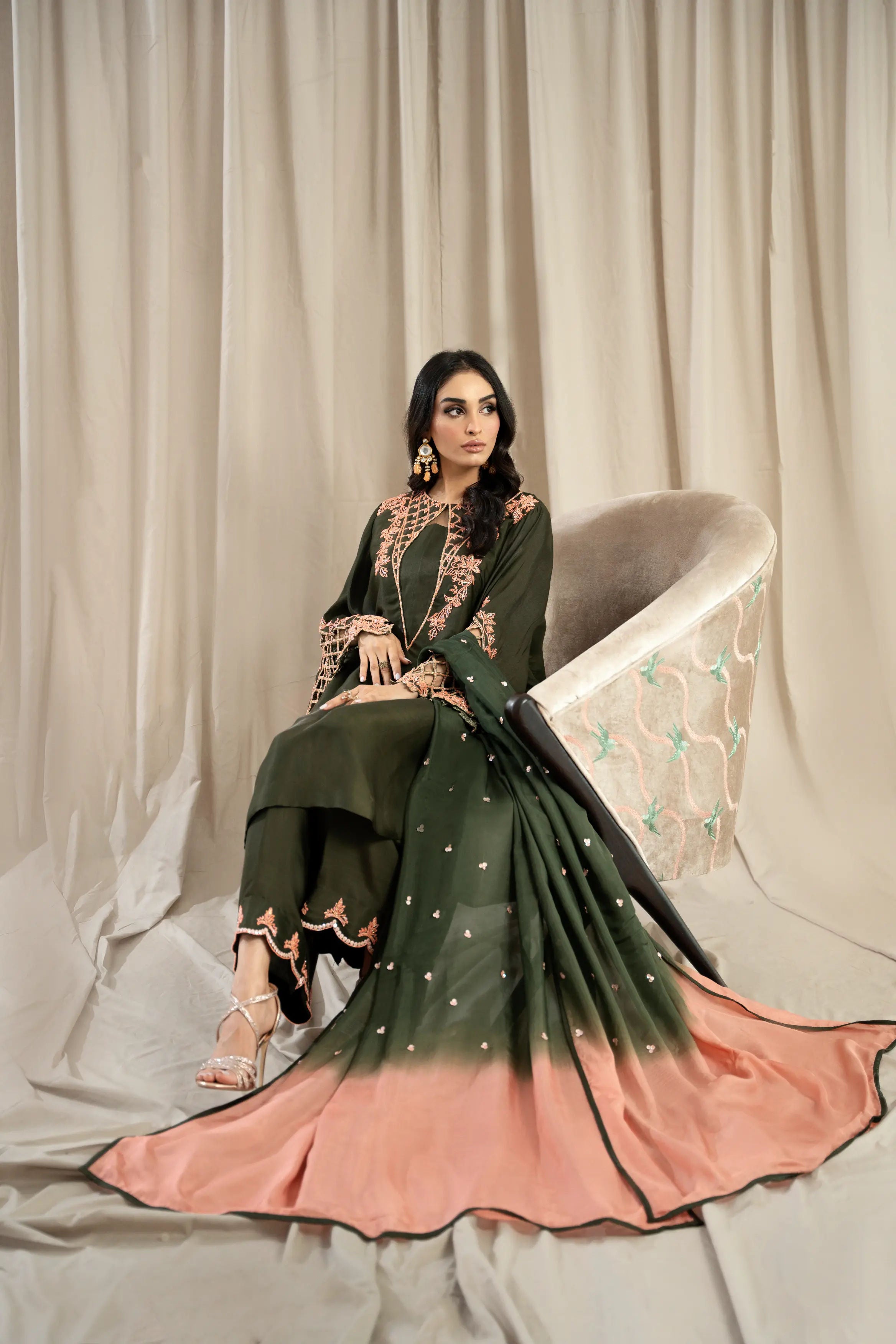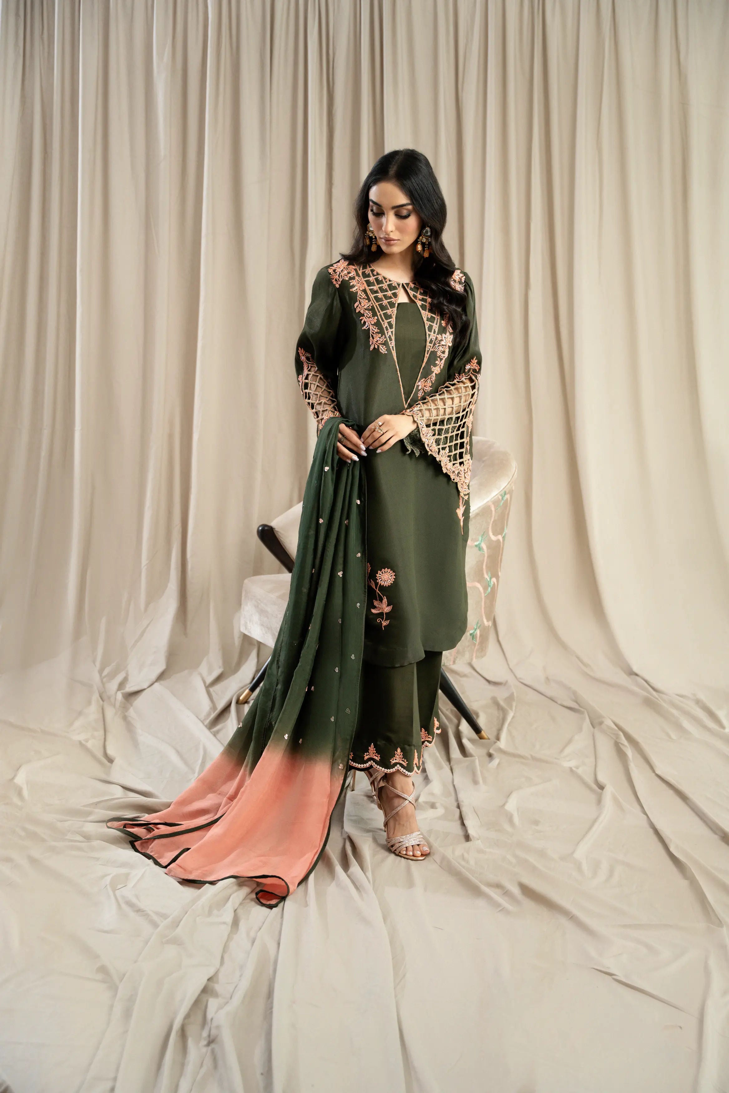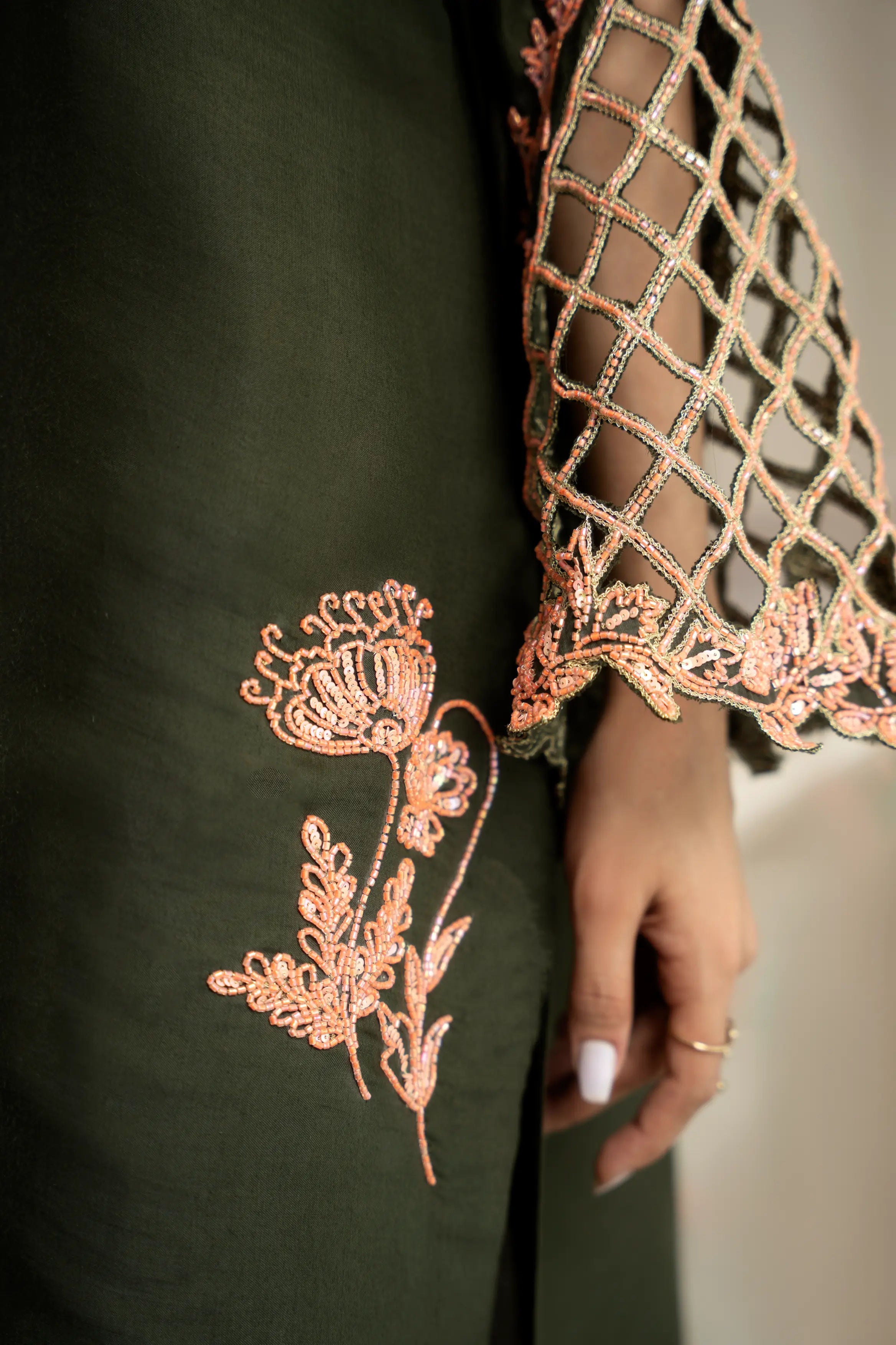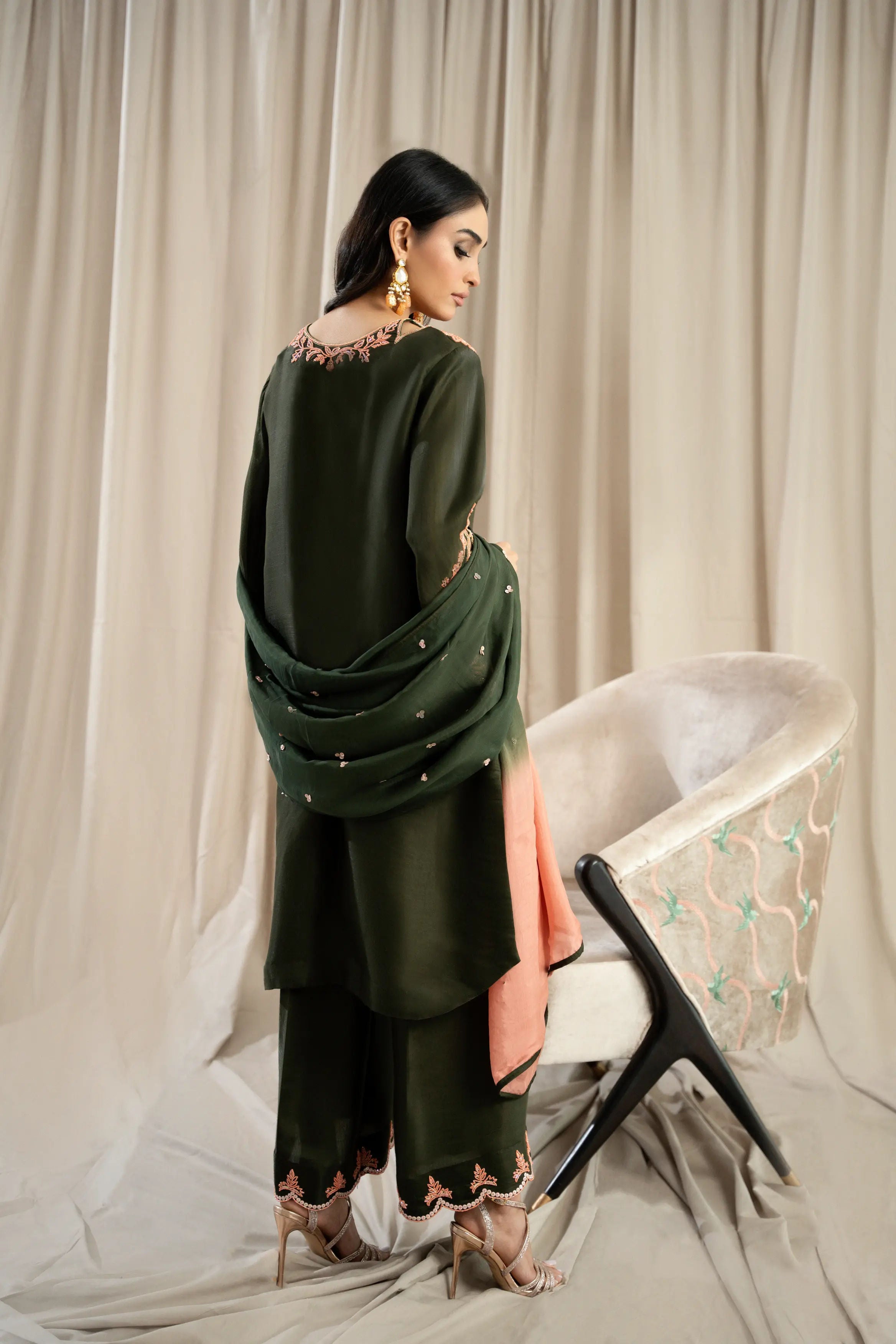 LIA - Festive Formal: The ensemble features a Forest green Sheesha silk mid-lenght shirt, slit sleeves paired with culottes. Shirt and trouser are embellished with intricate contrasting tea pink hand embroidery of bead, sequins and cutwork. Paired with medium silk tie dye dupatta with contrasting palus, embellished with heavy sequins chaan exuding effortless elegance.