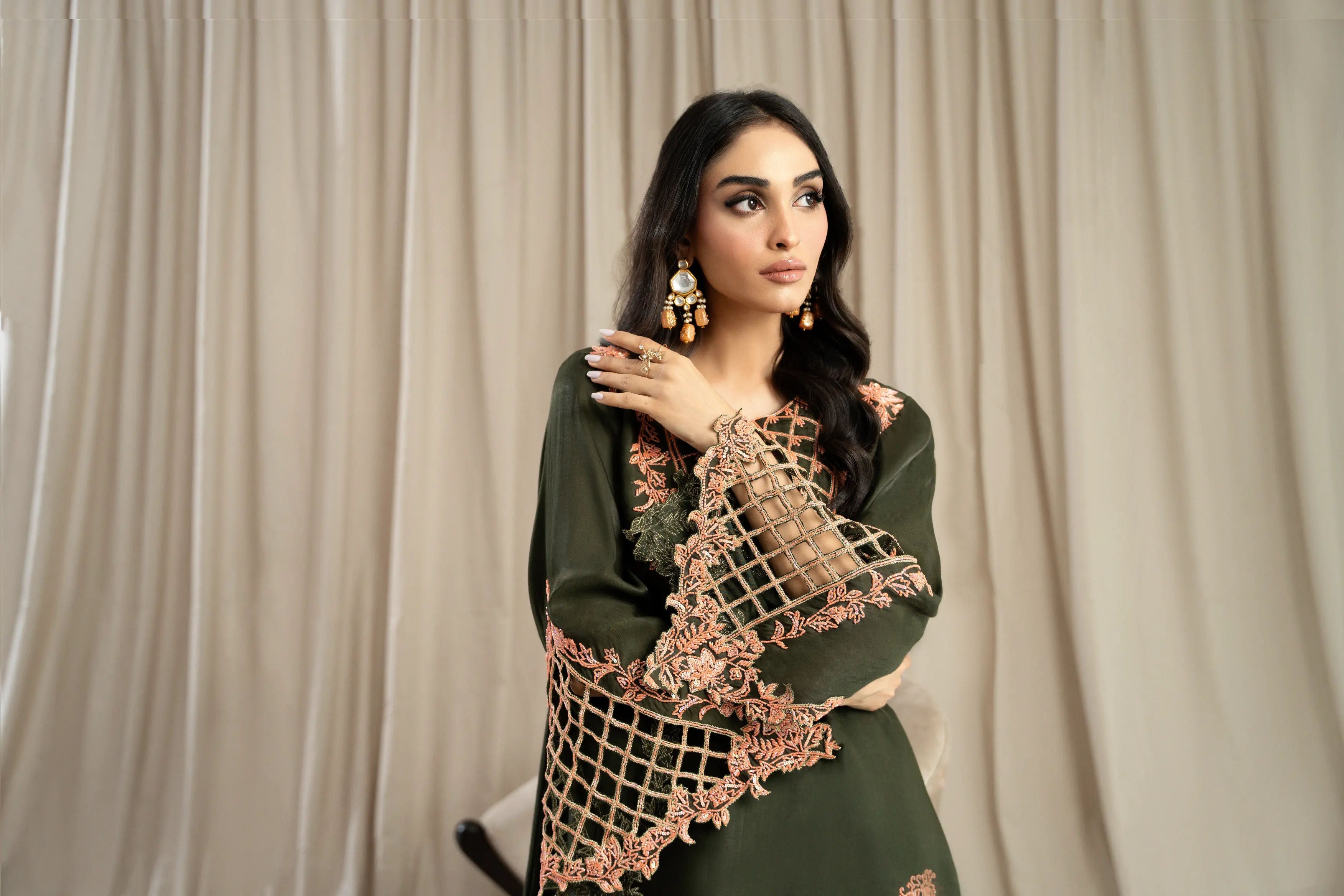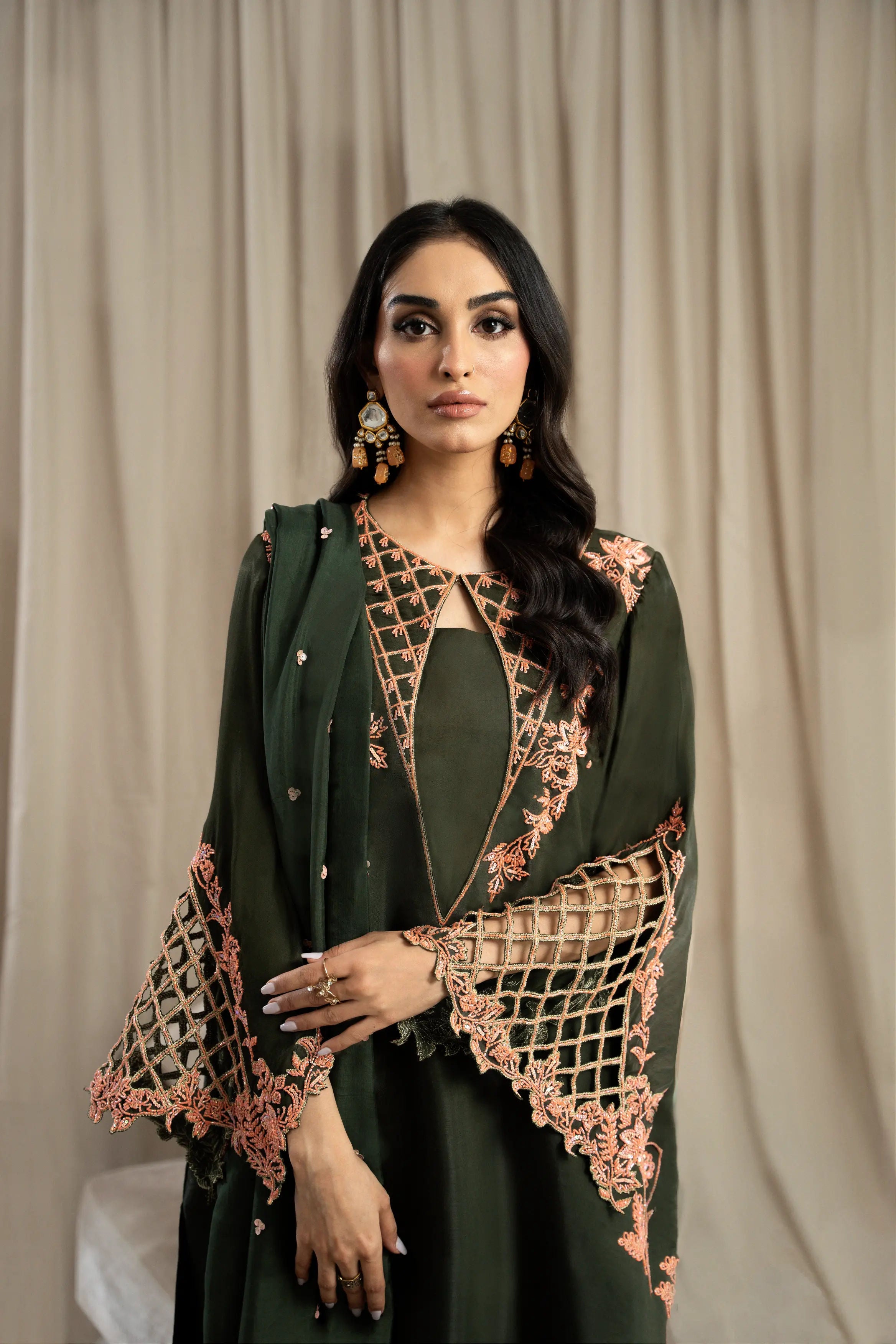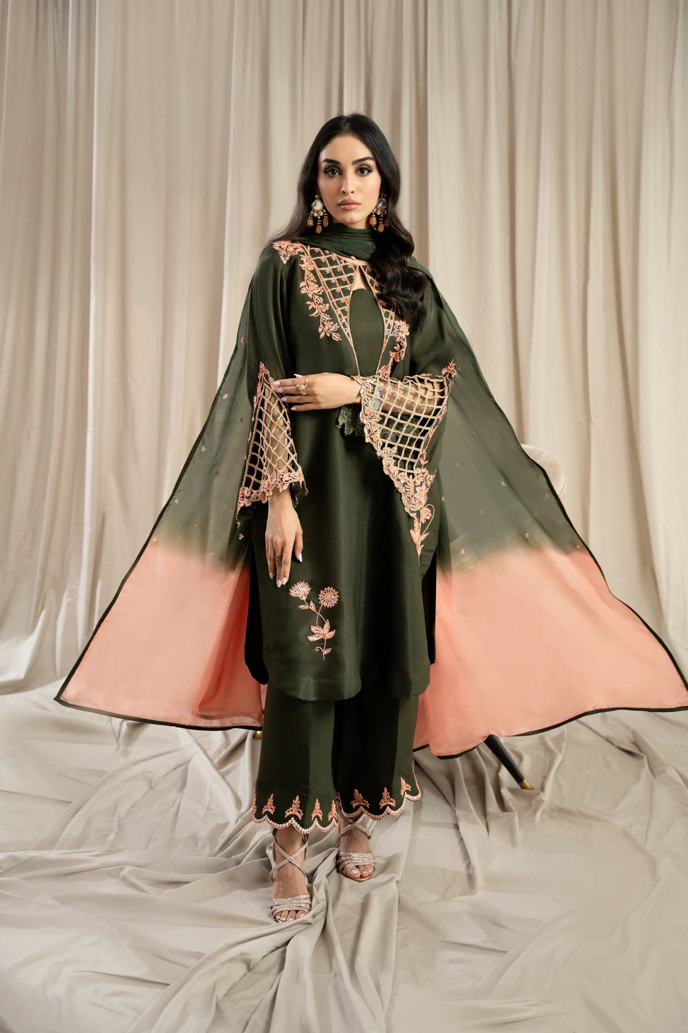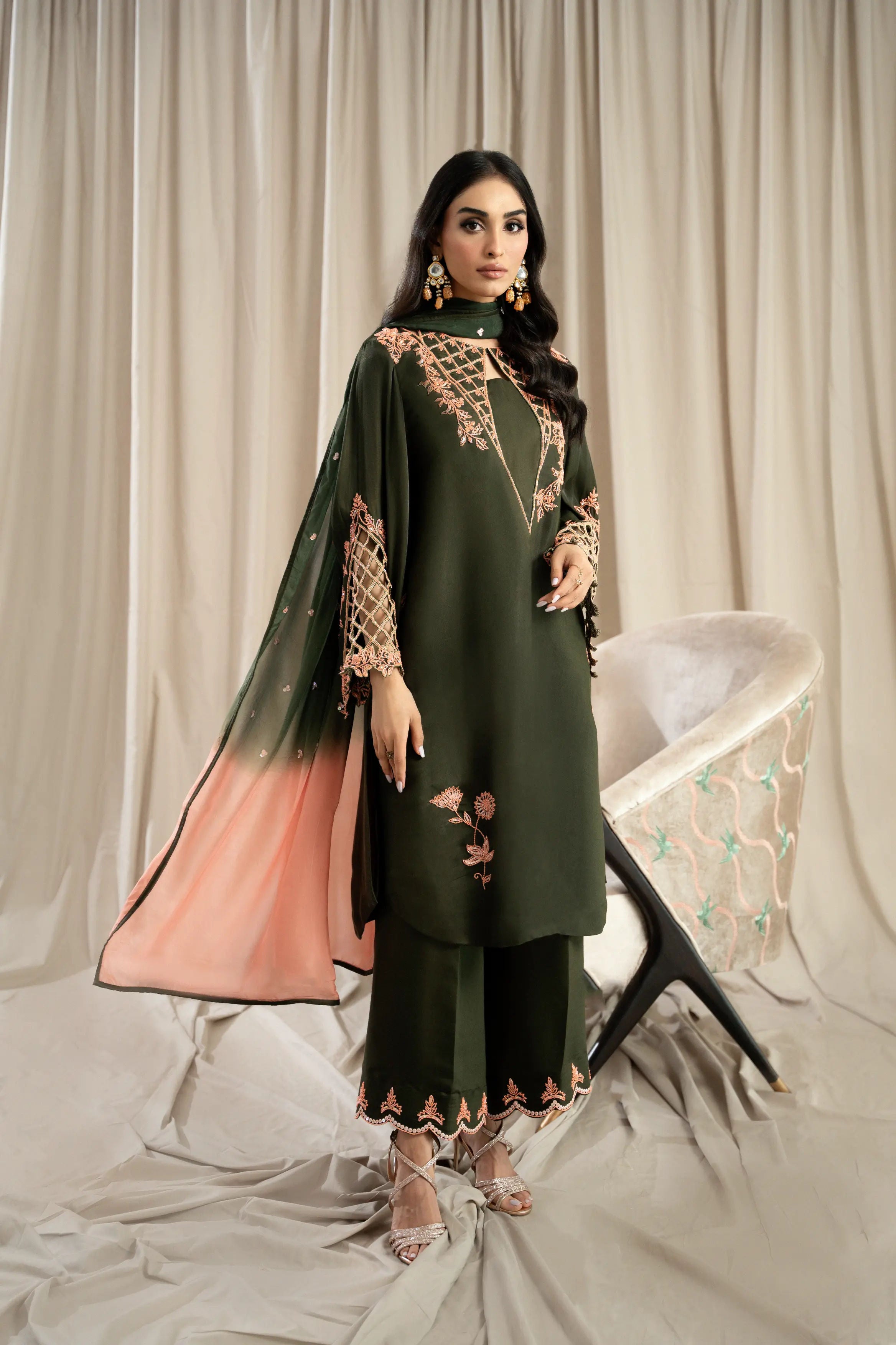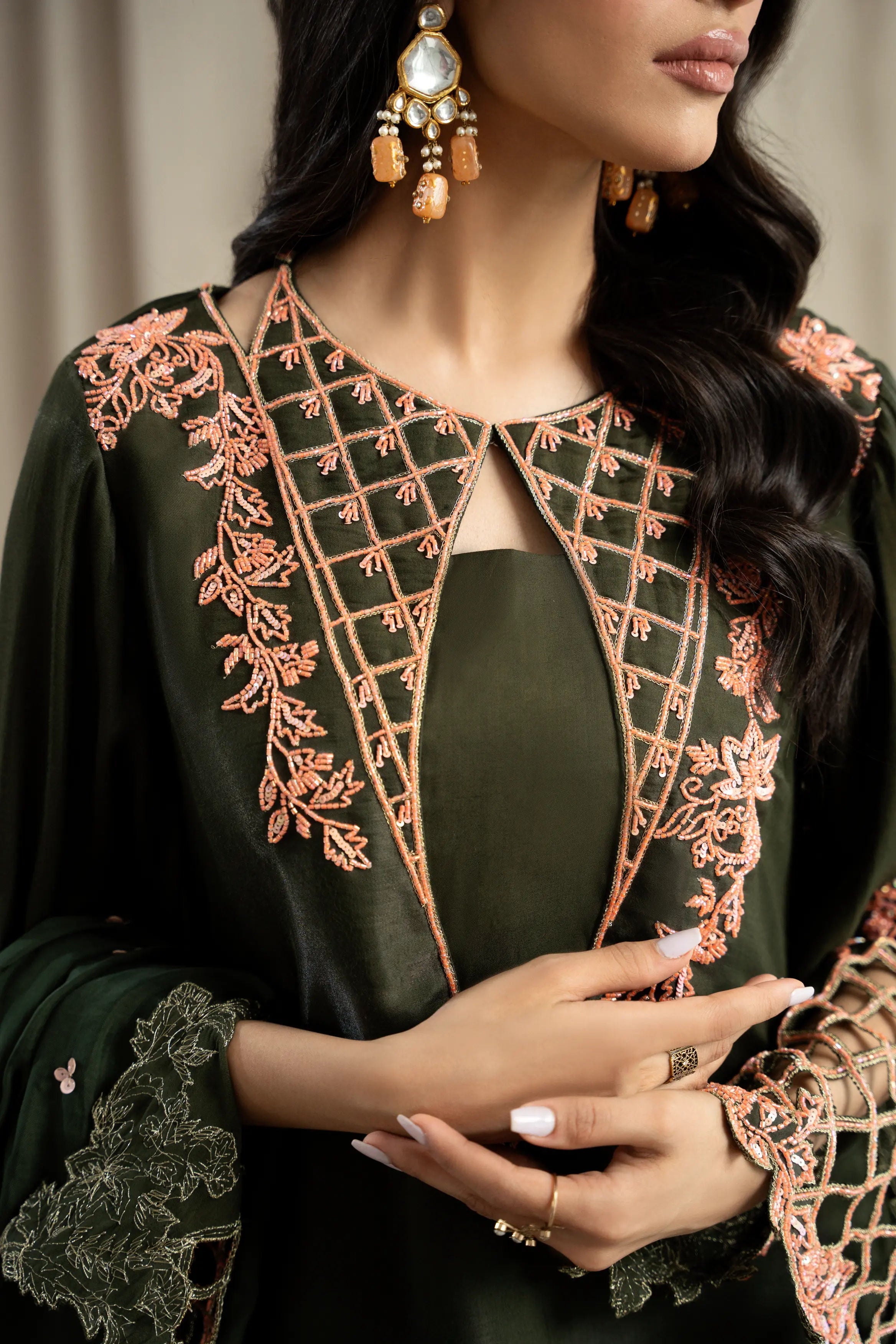 LIA - Festive Formal: The ensemble features a Forest green Sheesha silk mid-lenght shirt, slit sleeves paired with culottes. Shirt and trouser are embellished with intricate contrasting tea pink hand embroidery of bead, sequins and cutwork. Paired with medium silk tie dye dupatta with contrasting palus, embellished with heavy sequins chaan exuding effortless elegance.