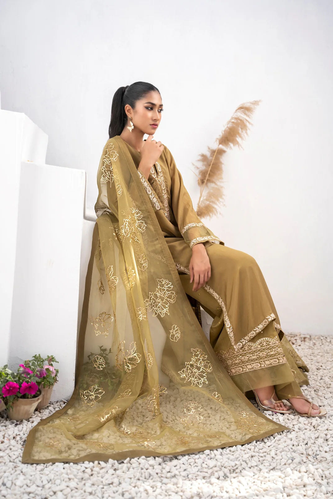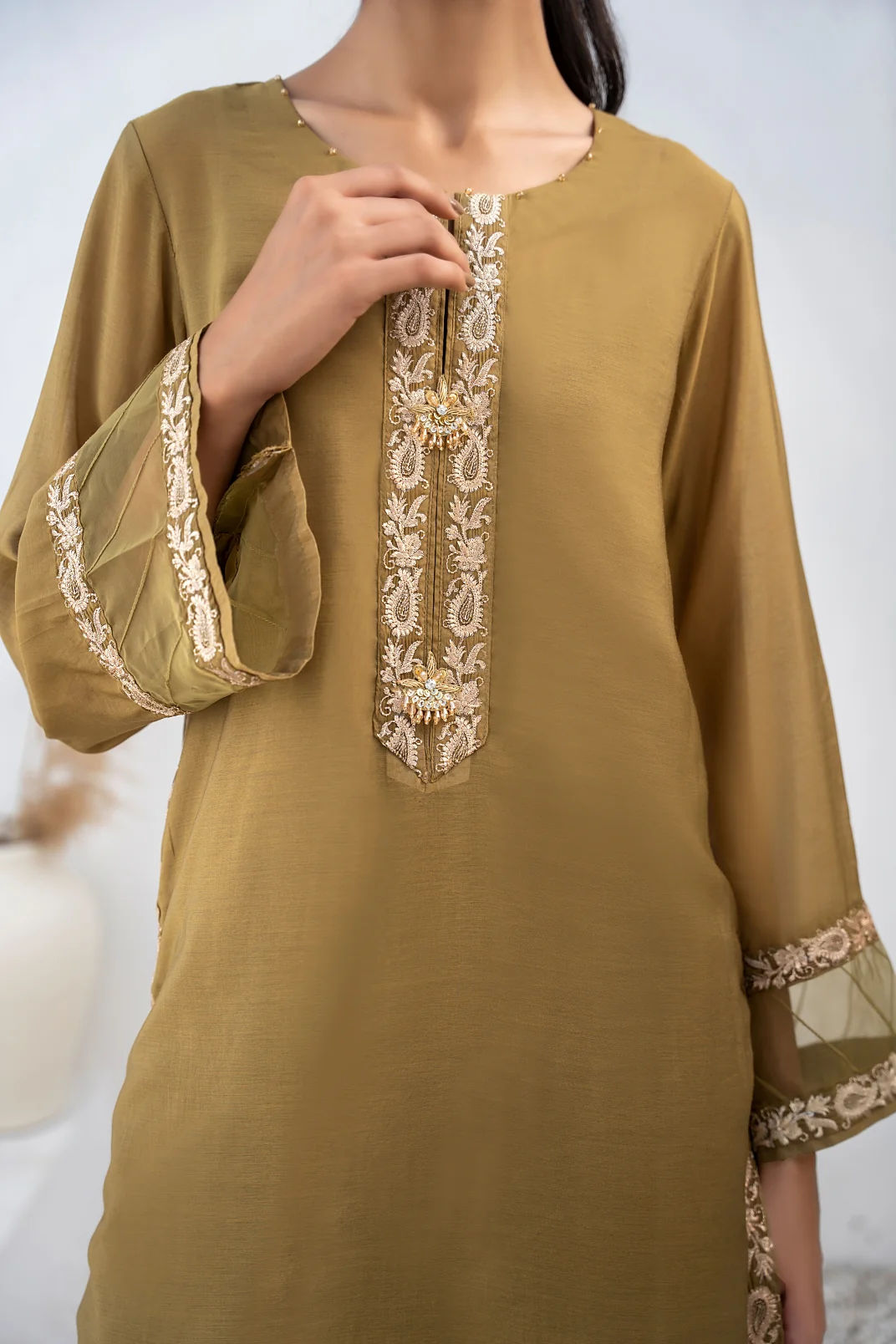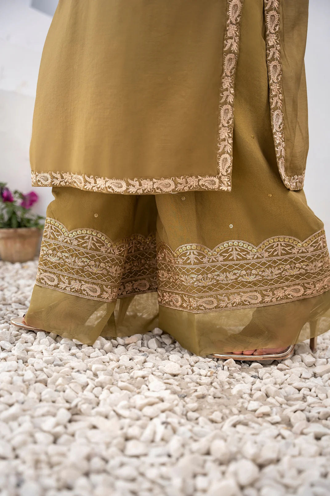 Melia'24: The ensemble features an olive green voile long tunic with a matching organza floral sequins machine embroidery dupatta. Shirt embellished with thread and sequins embroidery on neckline, hem and sleeve. Finished with hand-embroidered motifs and organza. Paired up with matching katan silk culottes featuring sequin and thread embroidery on the bottom to create an elegant and classic look.