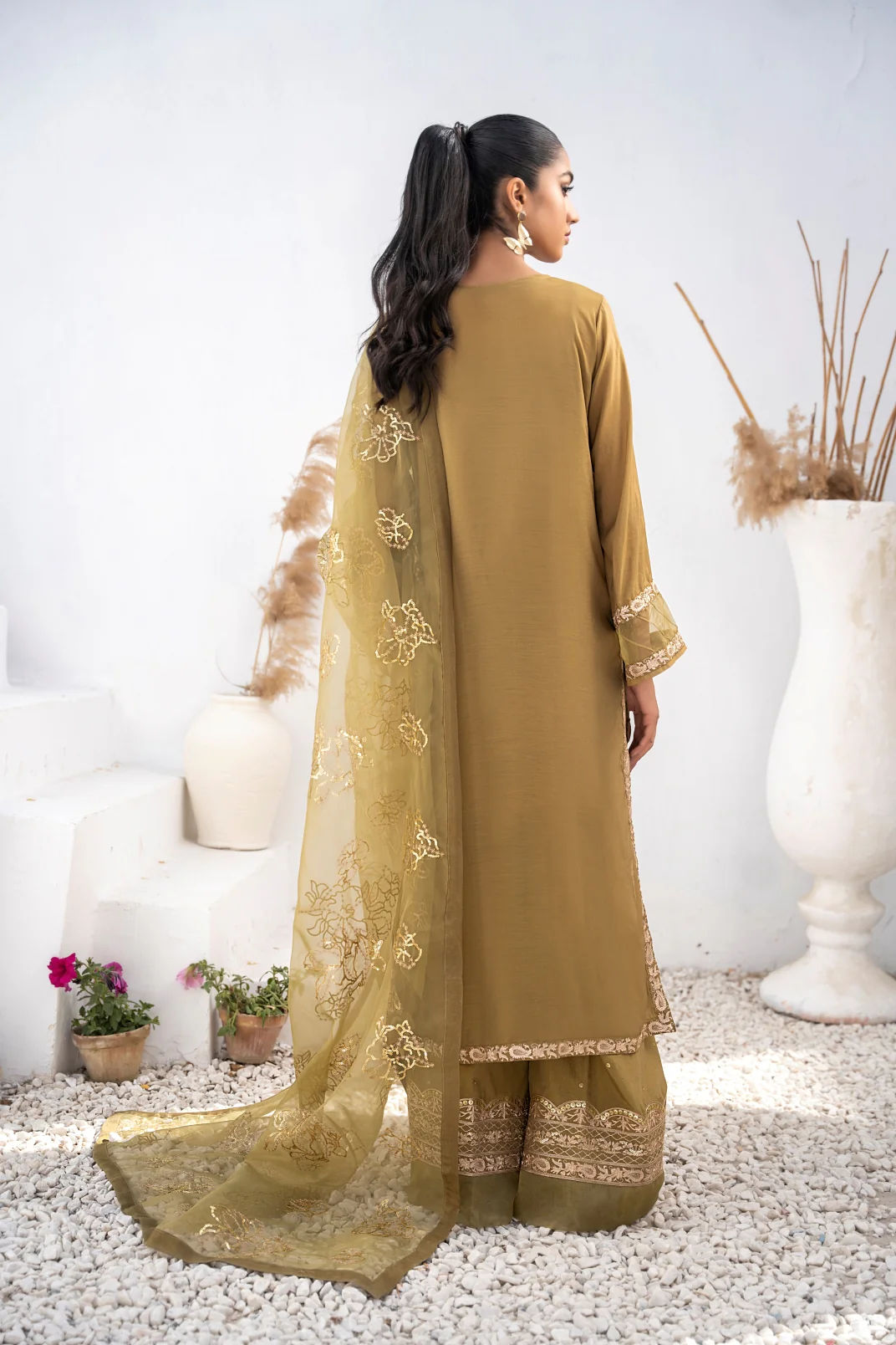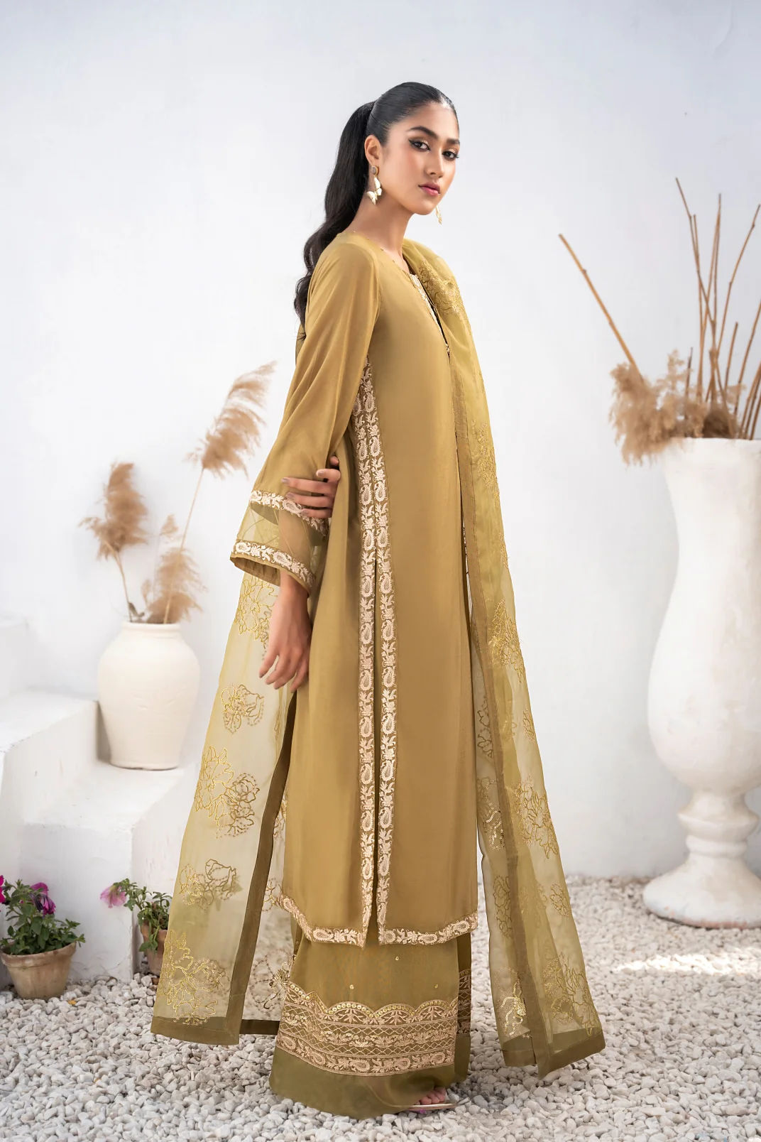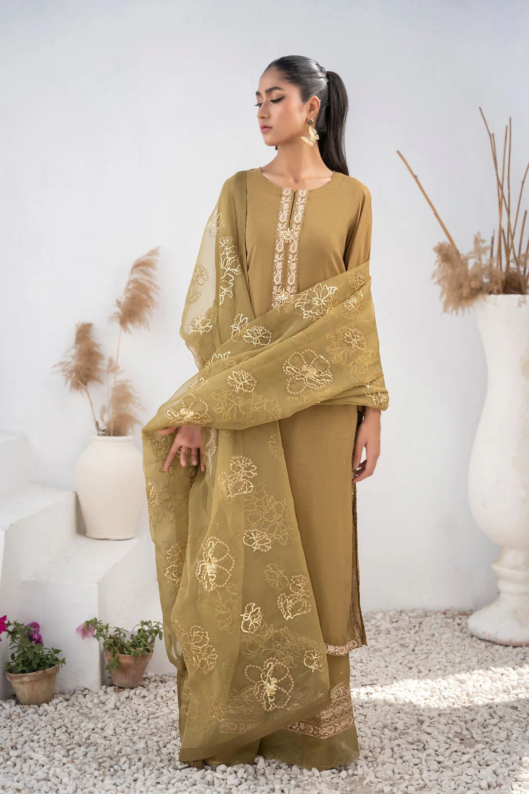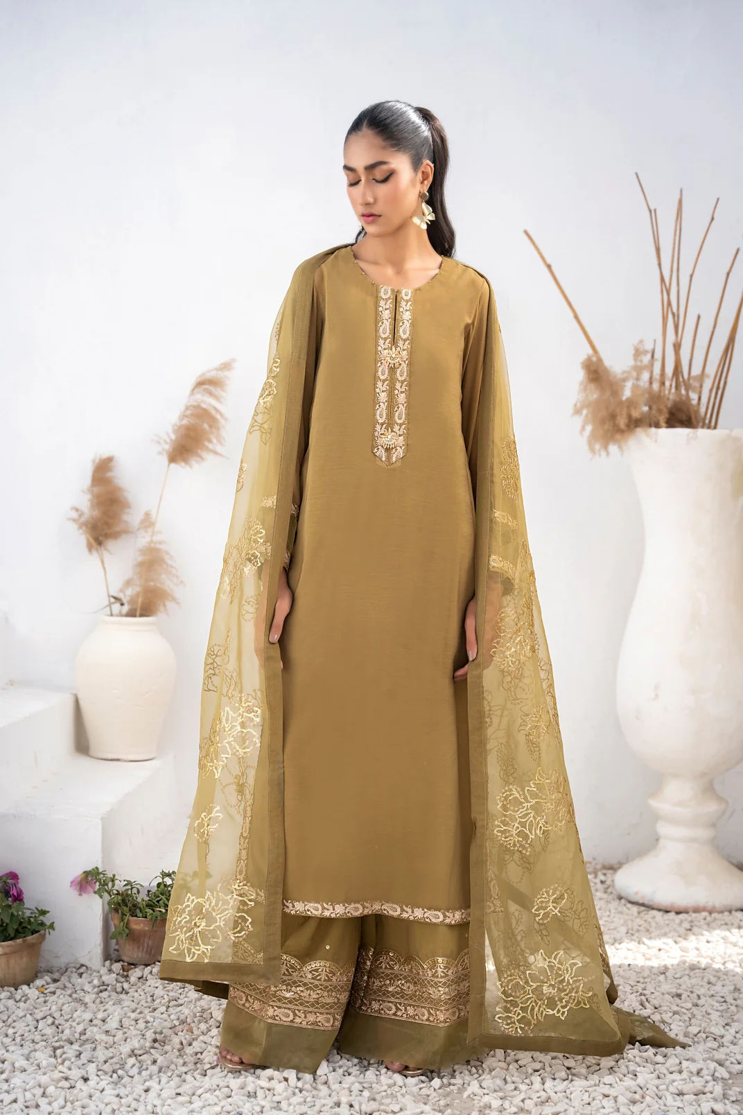 Melia'24: The ensemble features an olive green voile long tunic with a matching organza floral sequins machine embroidery dupatta. Shirt embellished with thread and sequins embroidery on neckline, hem and sleeve. Finished with hand-embroidered motifs and organza. Paired up with matching katan silk culottes featuring sequin and thread embroidery on the bottom to create an elegant and classic look.