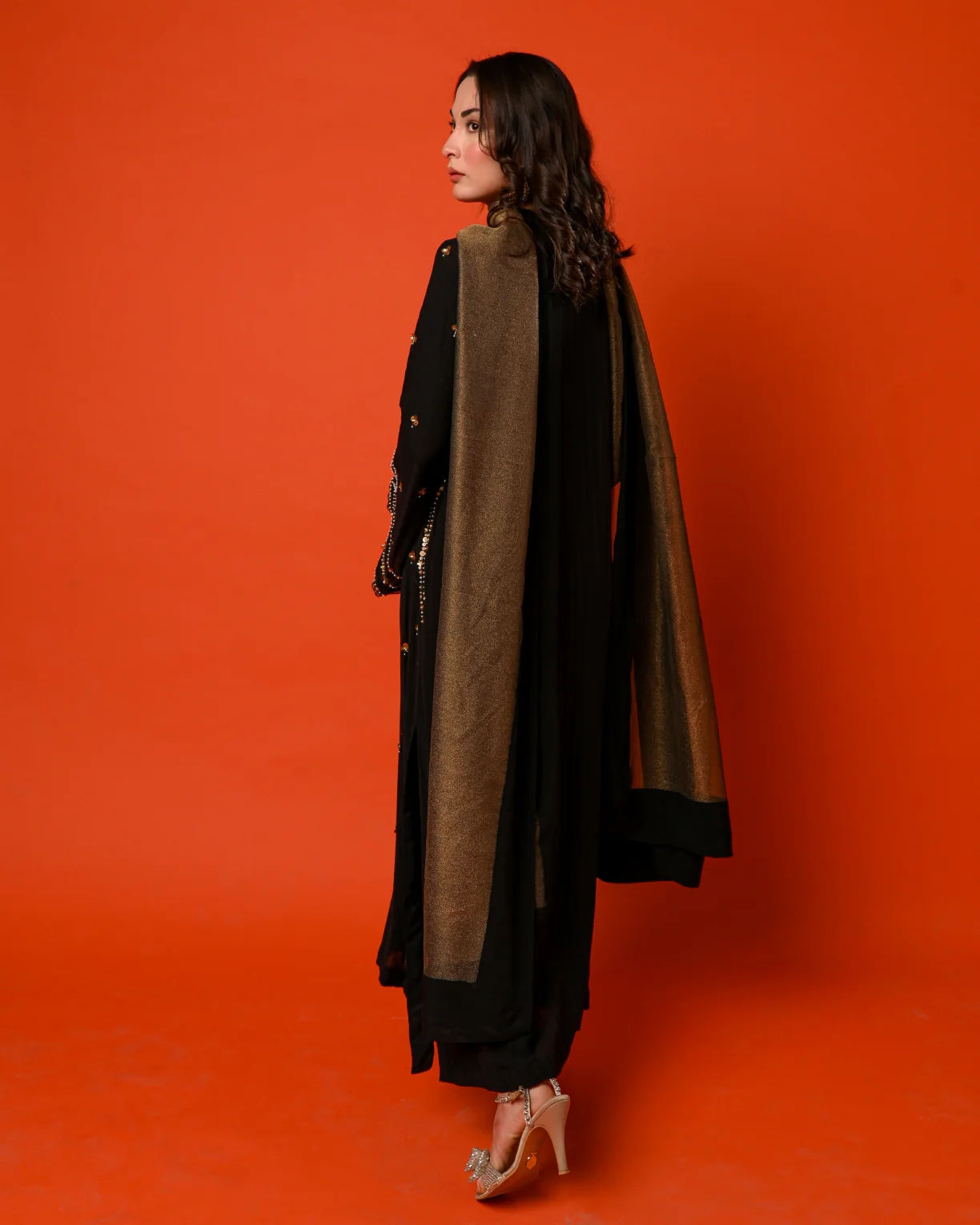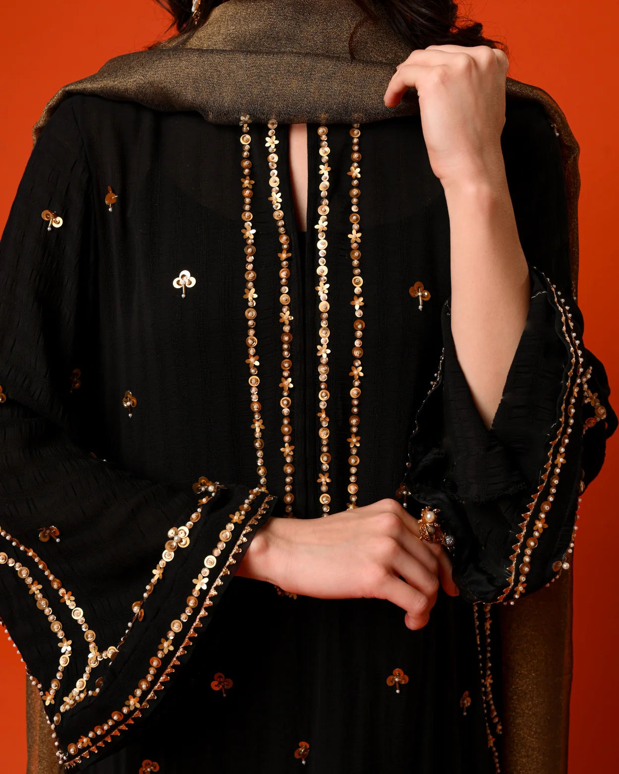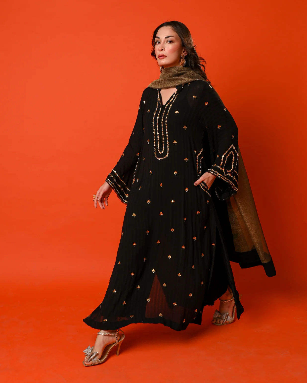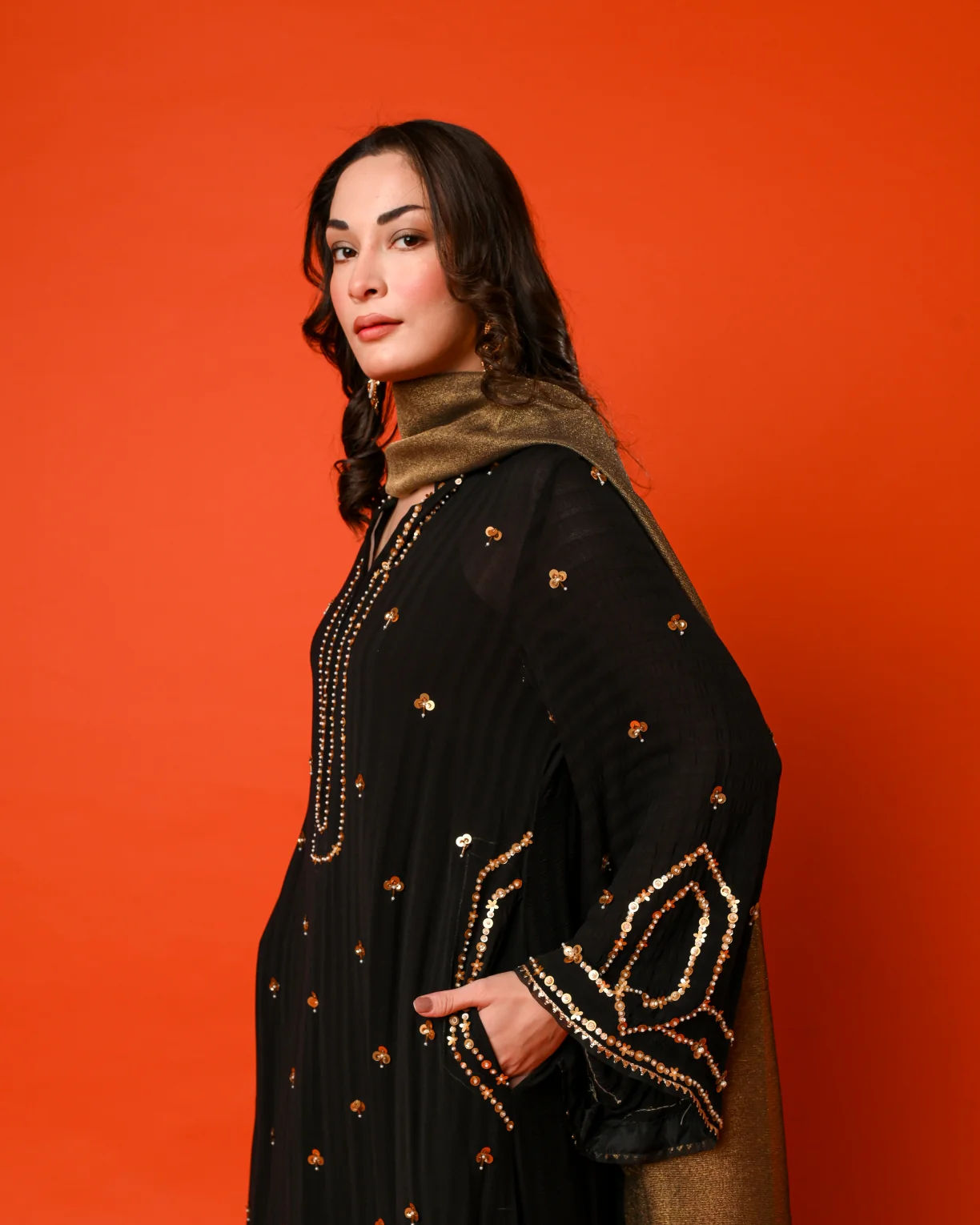 Chamakta Sitara Luxury pret(MCS4): Plain Black crepe georgette A line long shirt with gold lace and organza detailing. Adorned with pearls, crystal beads & sequins hand embroidery all over. Paired up with same colour crepe georgette culottes and zari net dupatta. A perfect chic look for this festive season.
