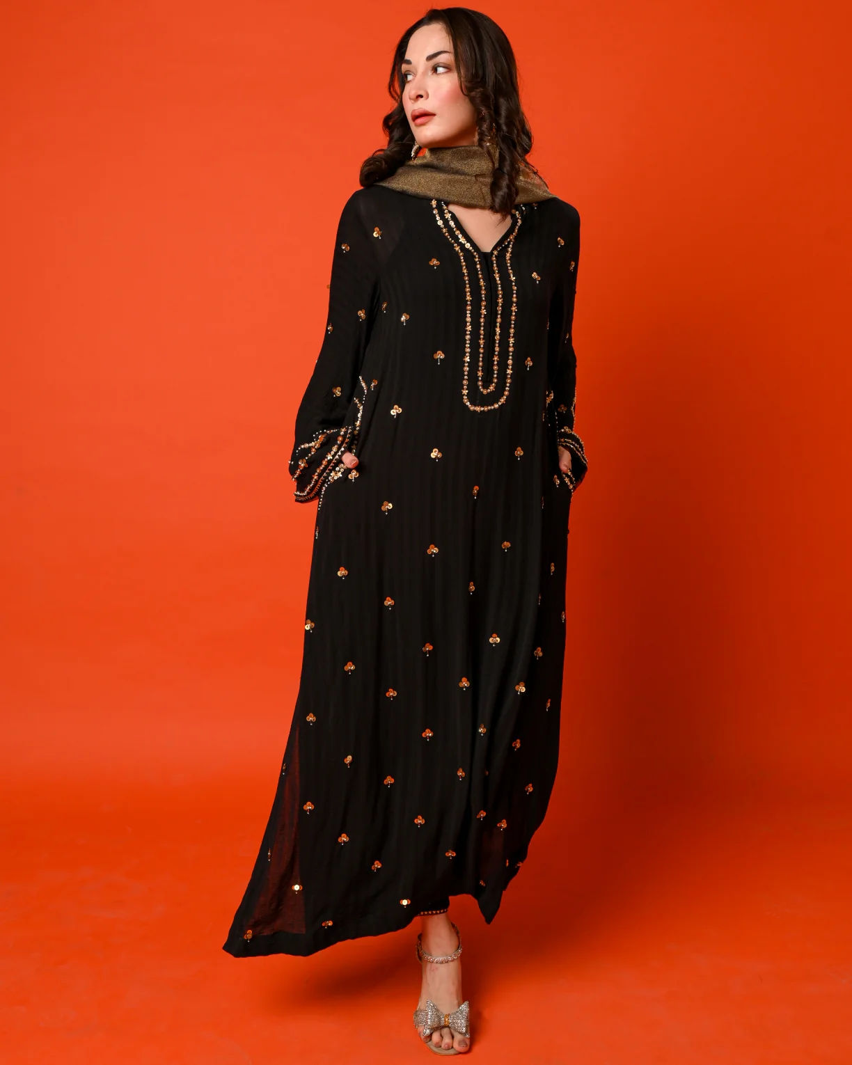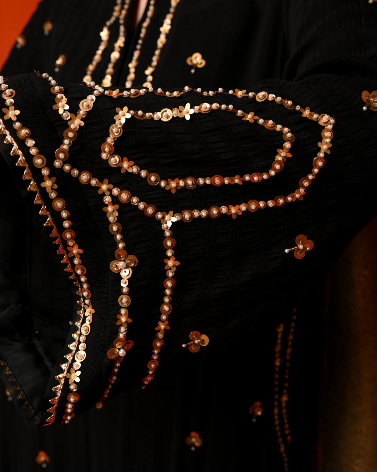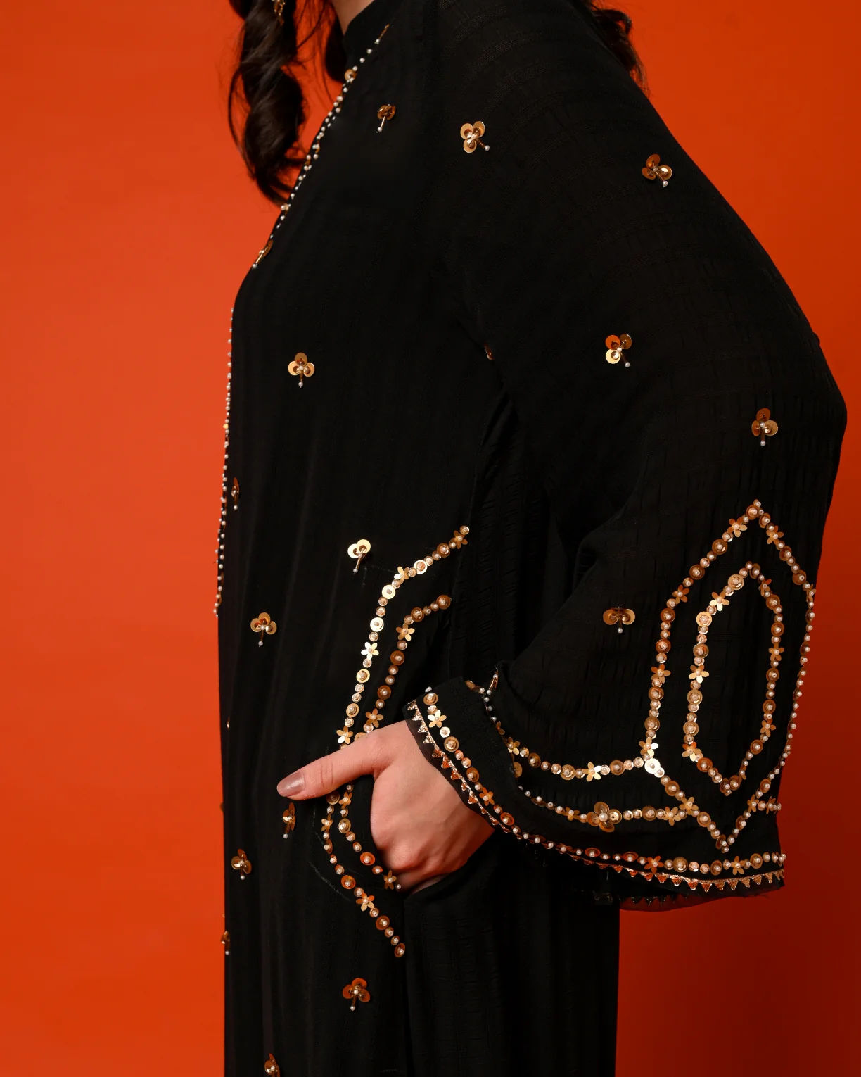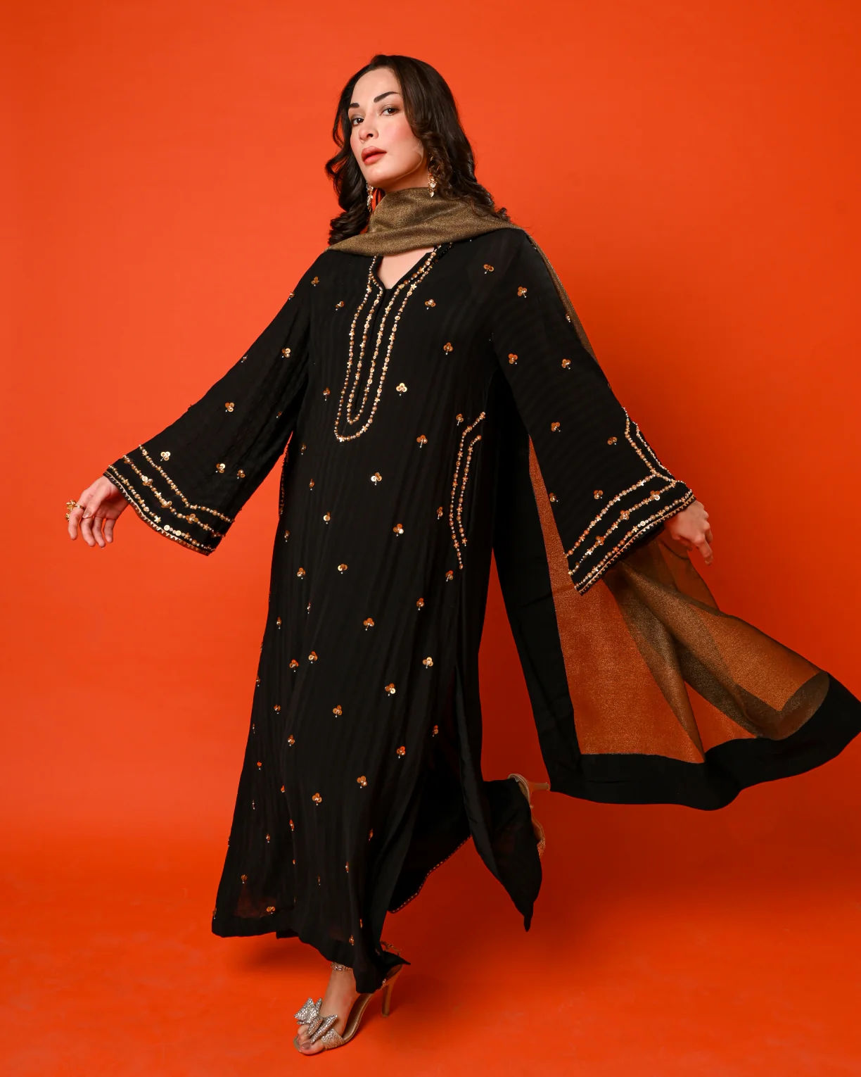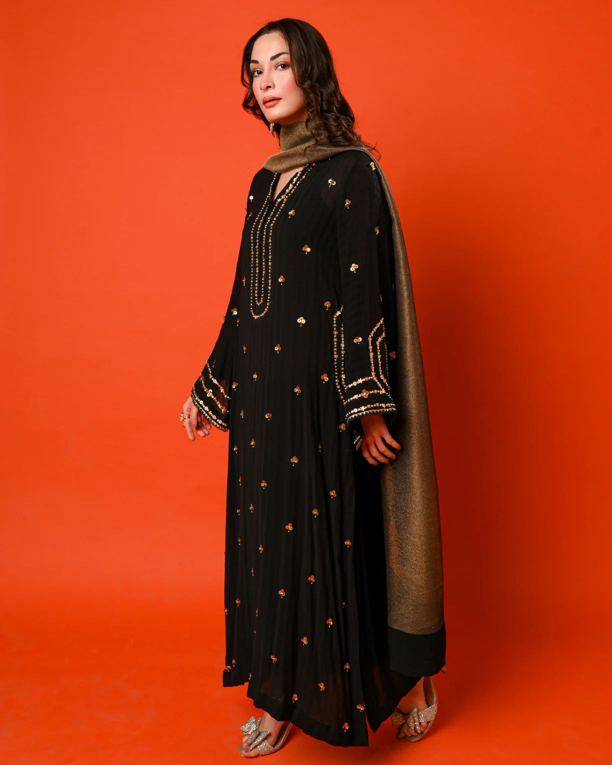 Chamakta Sitara Luxury pret(MCS4): Plain Black crepe georgette A line long shirt with gold lace and organza detailing. Adorned with pearls, crystal beads & sequins hand embroidery all over. Paired up with same colour crepe georgette culottes and zari net dupatta. A perfect chic look for this festive season.