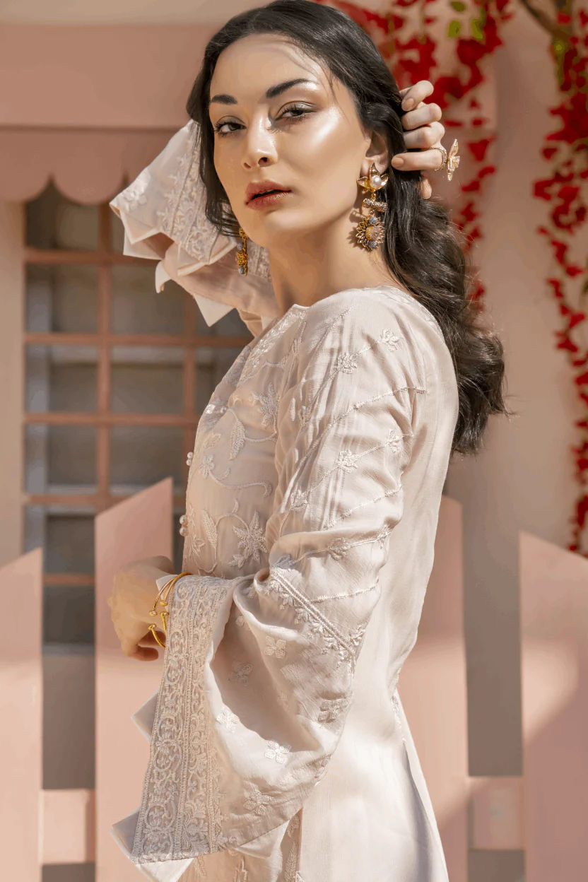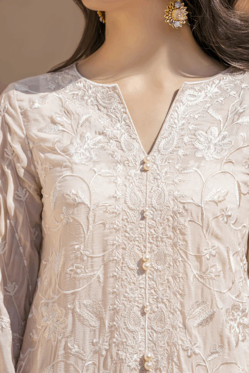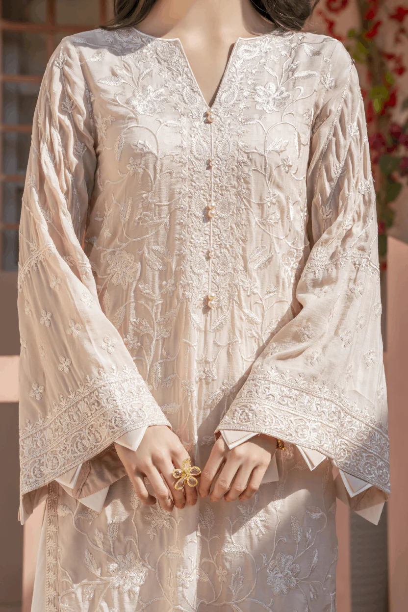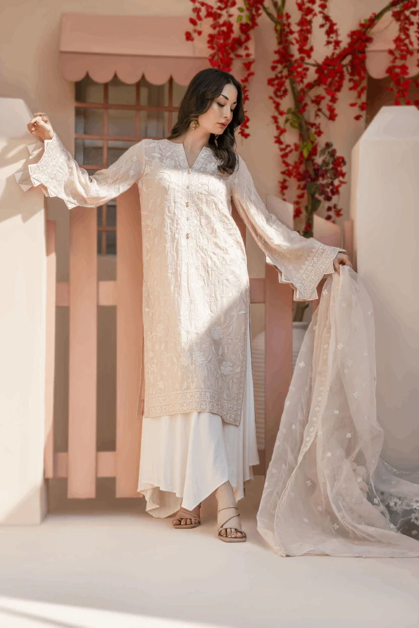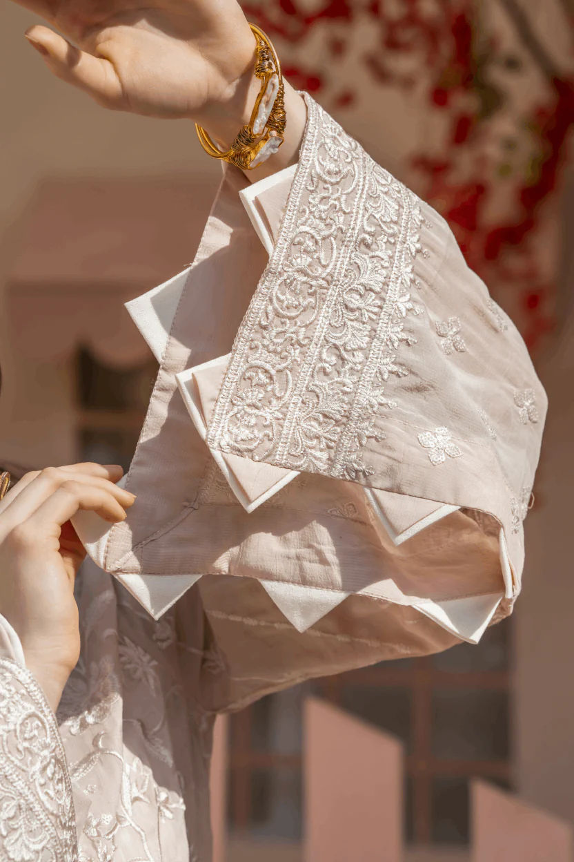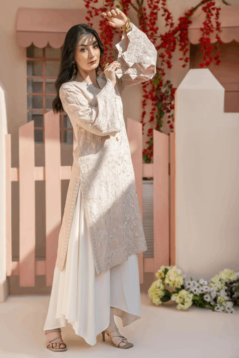 Opal pink swiss voile shirt with ivory tones. A-line shirt adorned with thread & sequins embroidery all over and pearls detailing on the neckline. Paired up with an ivory color jacquard fabric asymmetrical Dhaka pajama and an embroidery organza dupatta. A perfect chic look for this festive season.