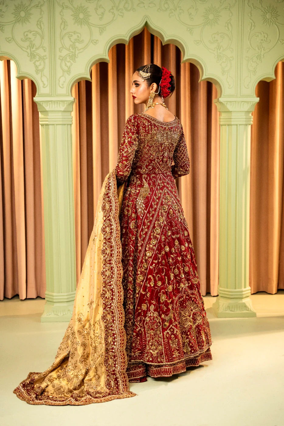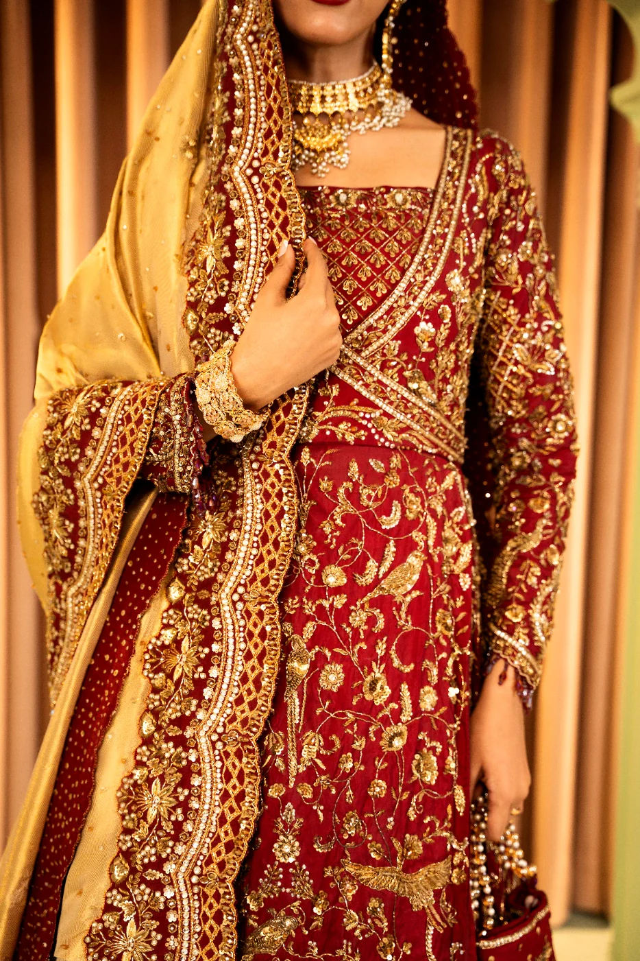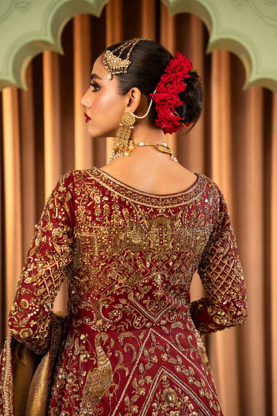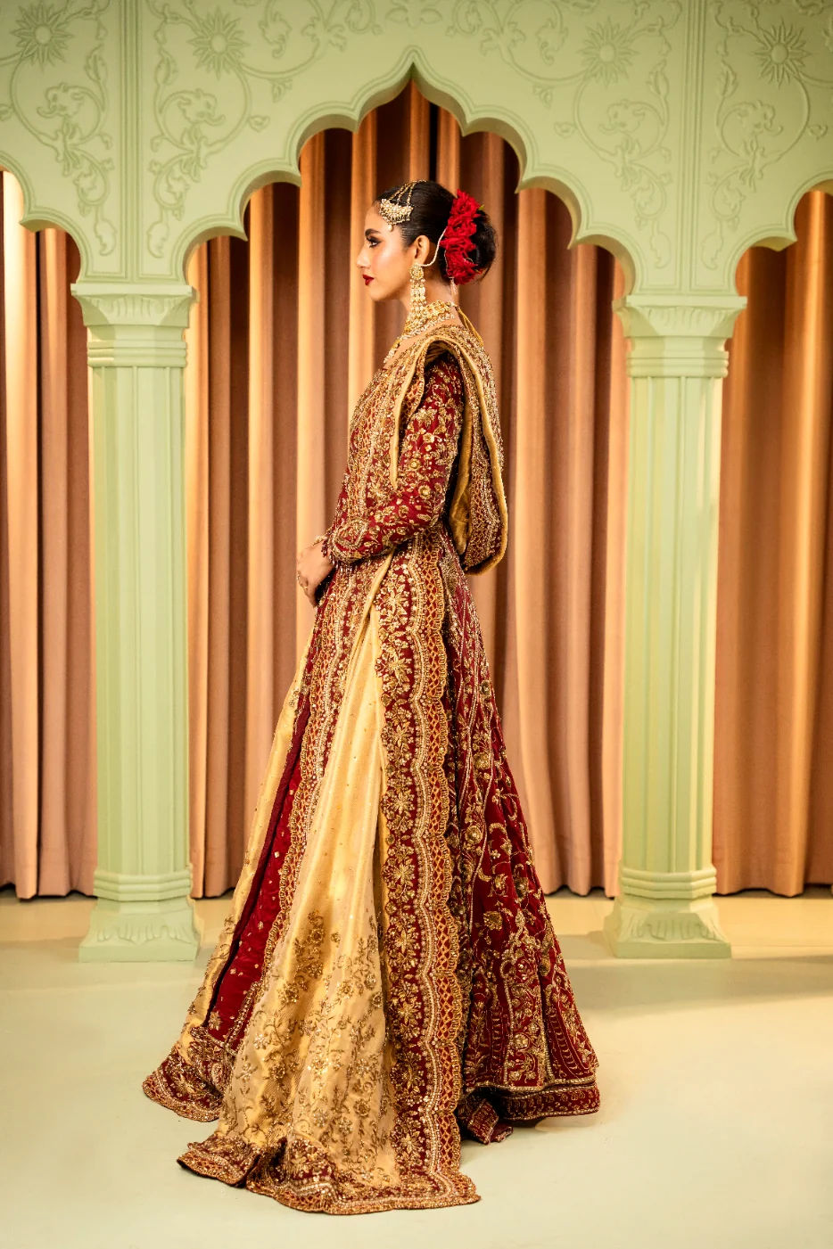 Radiate regalness in this deep maroon and metallic dull gold hued angrakha cut from pure rawsilk and pure lama net, featuring Mughal inspired motifs to give it a regal look. Detailed zardoze work in a dull gold, silver and gold composition. A lama net dupatta with scattered motifs, crystals, stones spray. Zardoze worked scalloped borders and fully worked pallus. The composition of the embroidery is inspired by Mughal gardens containing motifs like Tree of life, Mughal figures, lots of different birds and specially the peacock. Peacock is the focal point of this whole composition it pops up through out the design.