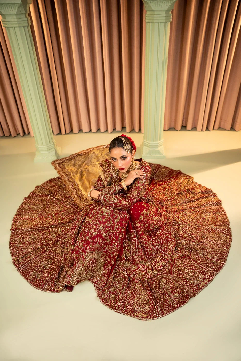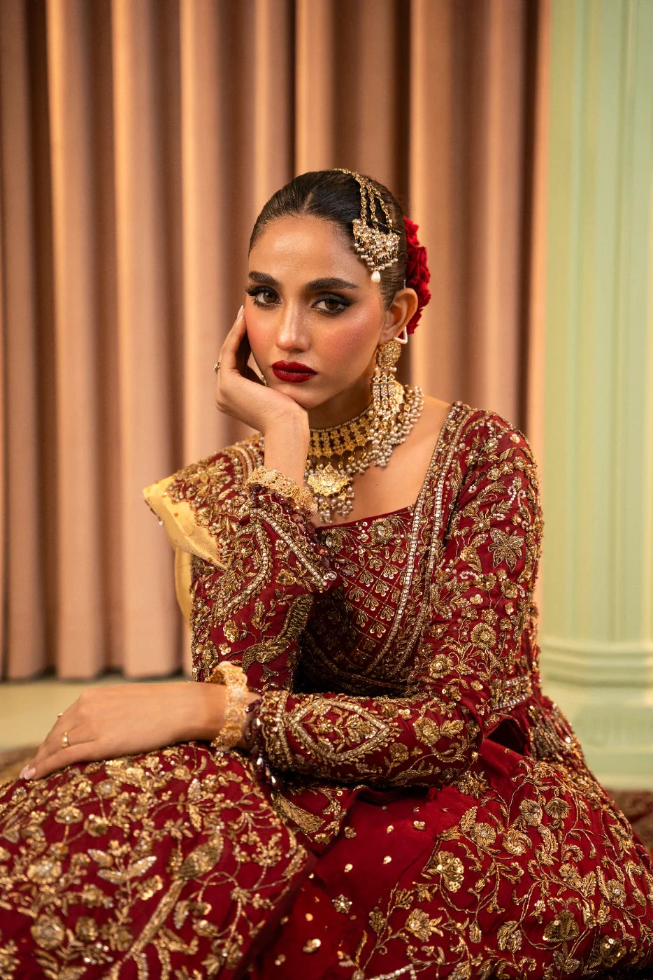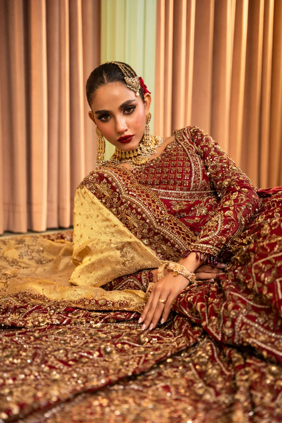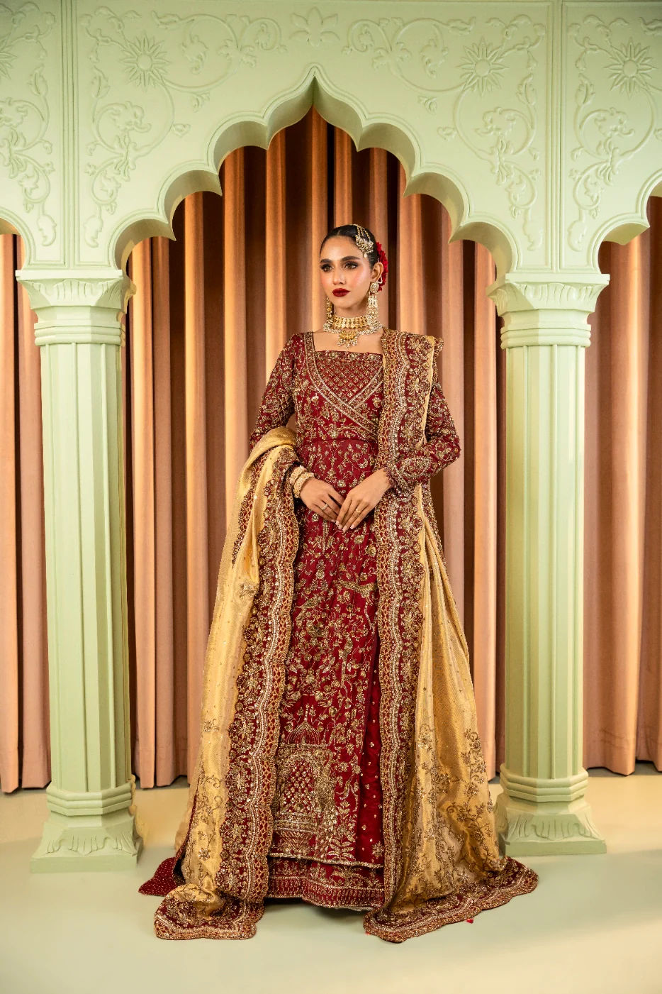 Radiate regalness in this deep maroon and metallic dull gold hued angrakha cut from pure rawsilk and pure lama net, featuring Mughal inspired motifs to give it a regal look. Detailed zardoze work in a dull gold, silver and gold composition. A lama net dupatta with scattered motifs, crystals, stones spray. Zardoze worked scalloped borders and fully worked pallus. The composition of the embroidery is inspired by Mughal gardens containing motifs like Tree of life, Mughal figures, lots of different birds and specially the peacock. Peacock is the focal point of this whole composition it pops up through out the design.