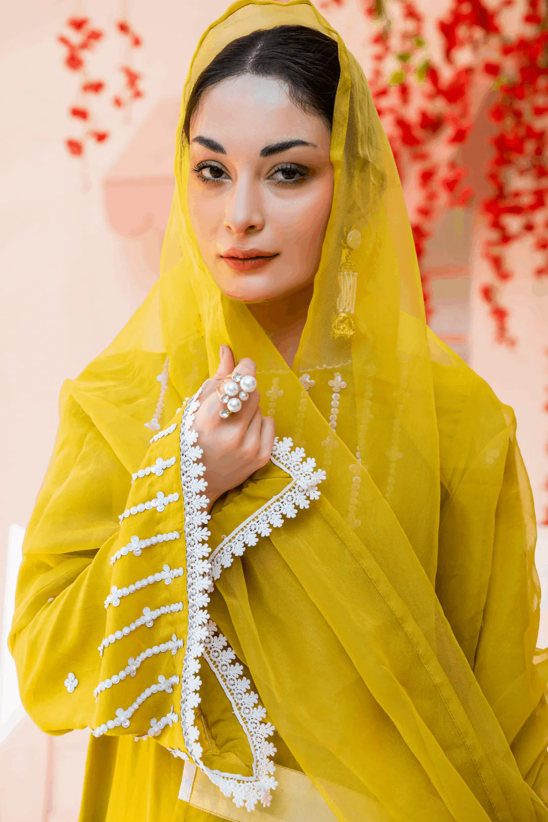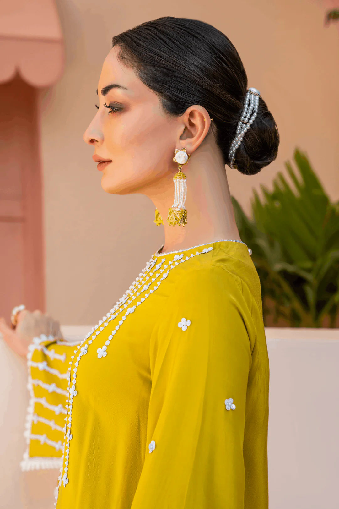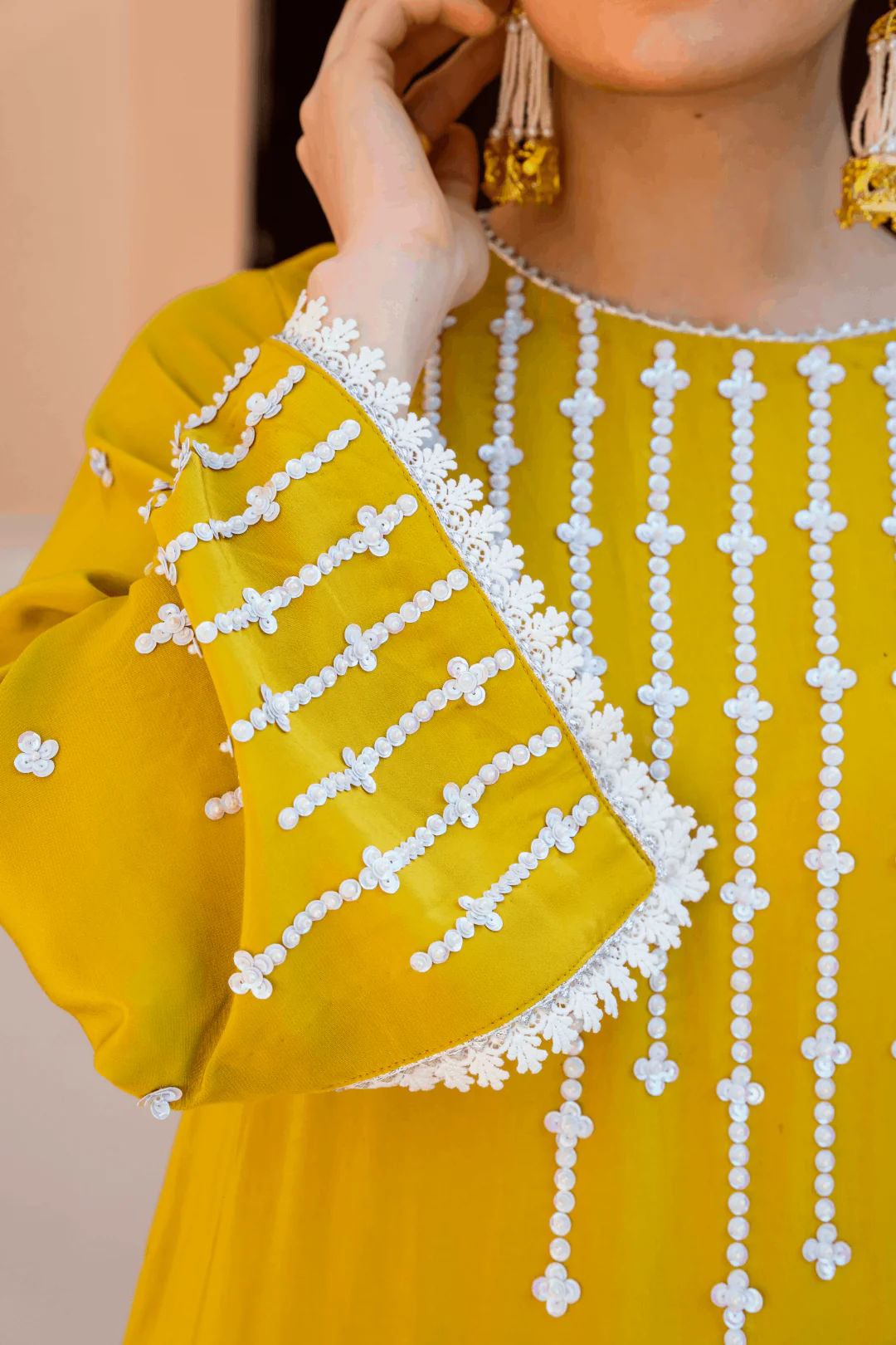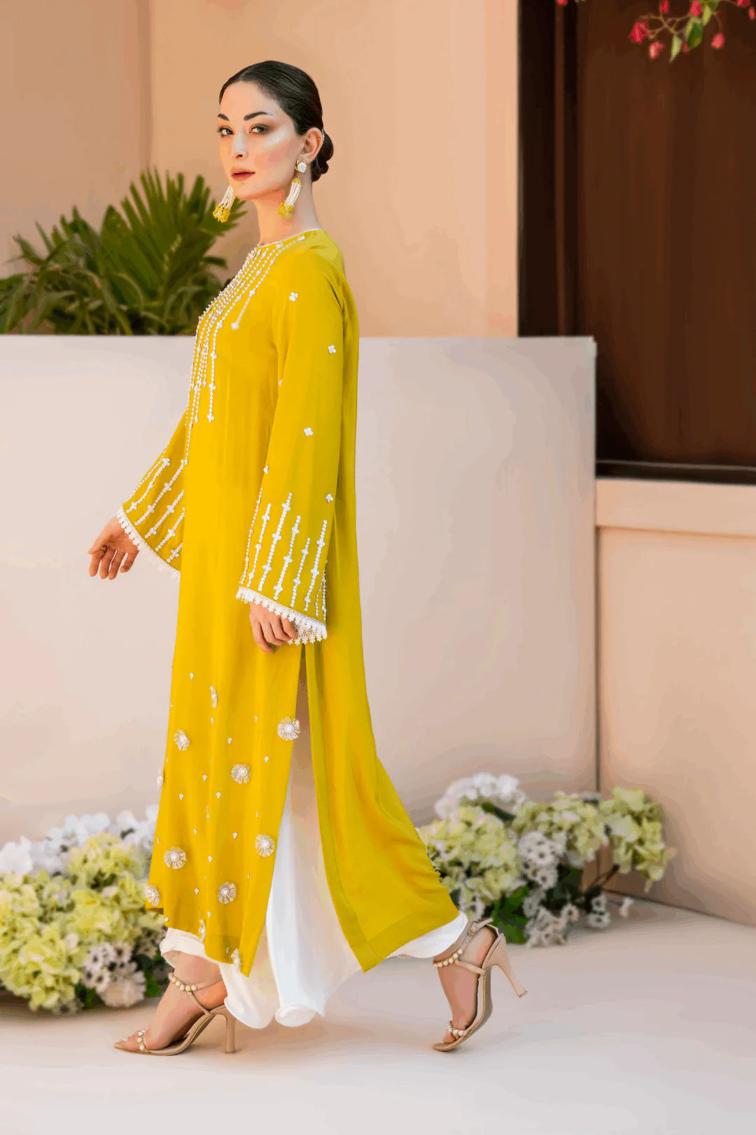 Canary yellow pure crepe georgette shirt with ivory accents. A line long tunic with slit sleeves adorned with thread, sequins, and pearls embroidery all over. Paired up with an ivory color jacquard fabric swirl Dhaka pajama and organza dupatta with ivory finishings. A perfect chic look for this festive season.