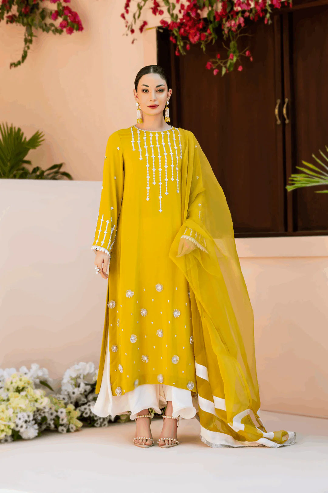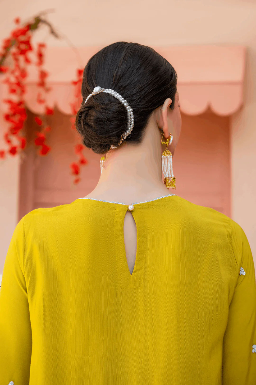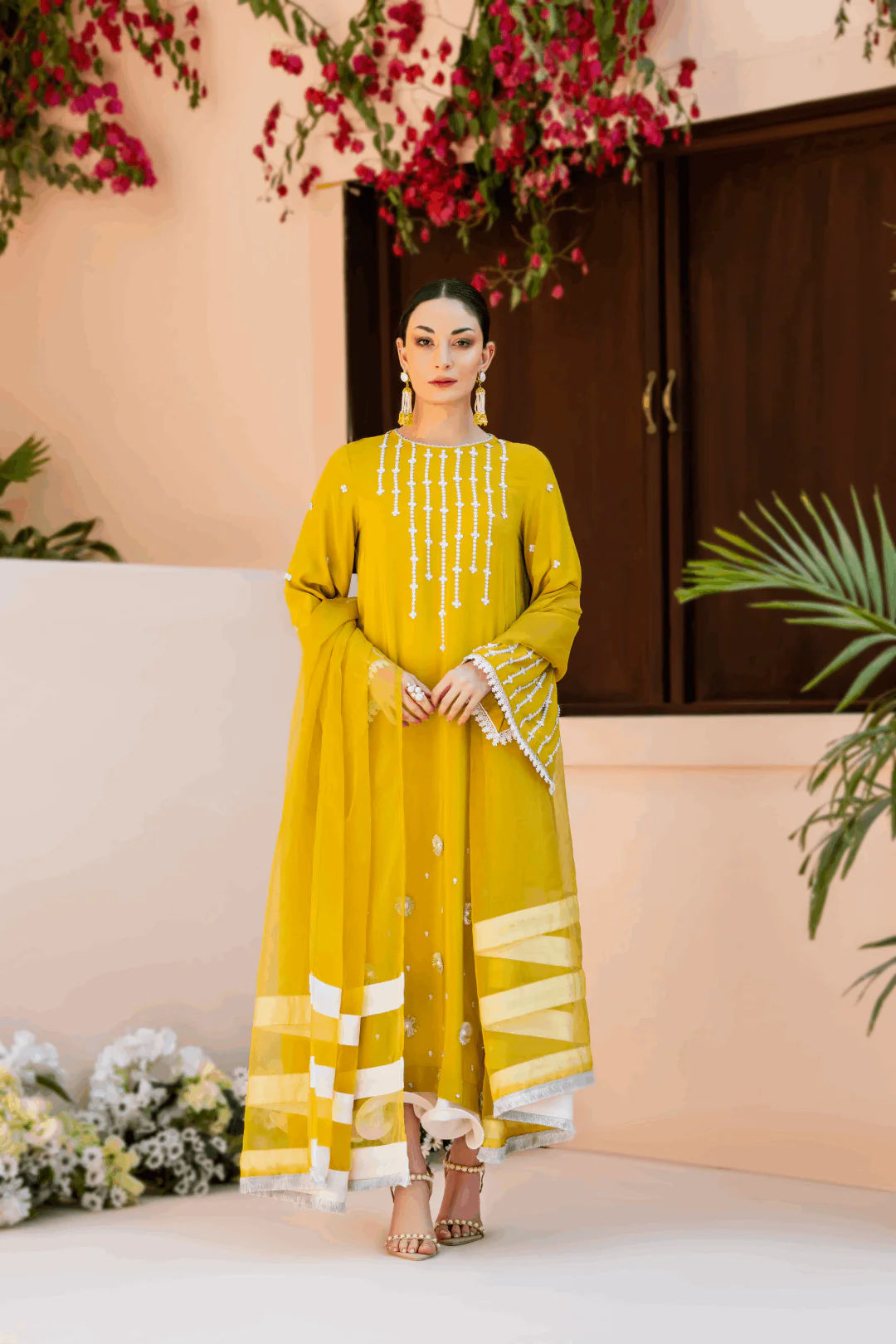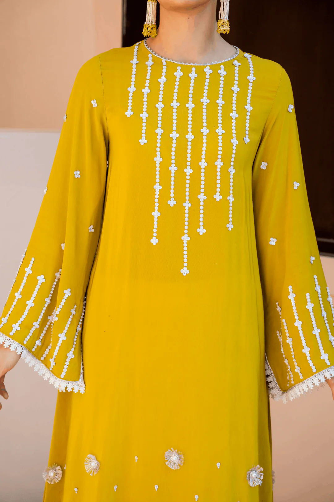 Canary yellow pure crepe georgette shirt with ivory accents. A line long tunic with slit sleeves adorned with thread, sequins, and pearls embroidery all over. Paired up with an ivory color jacquard fabric swirl Dhaka pajama and organza dupatta with ivory finishings. A perfect chic look for this festive season.