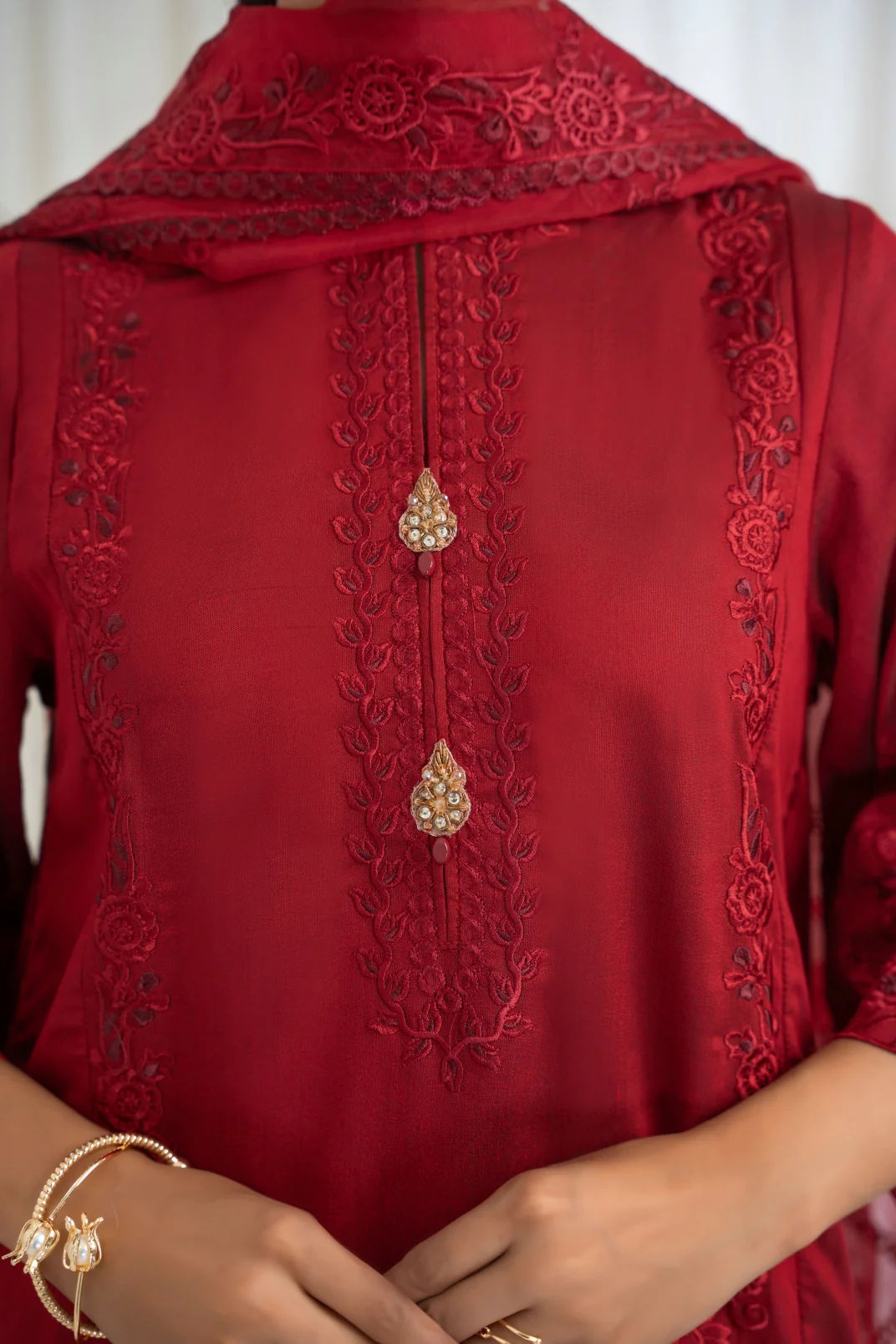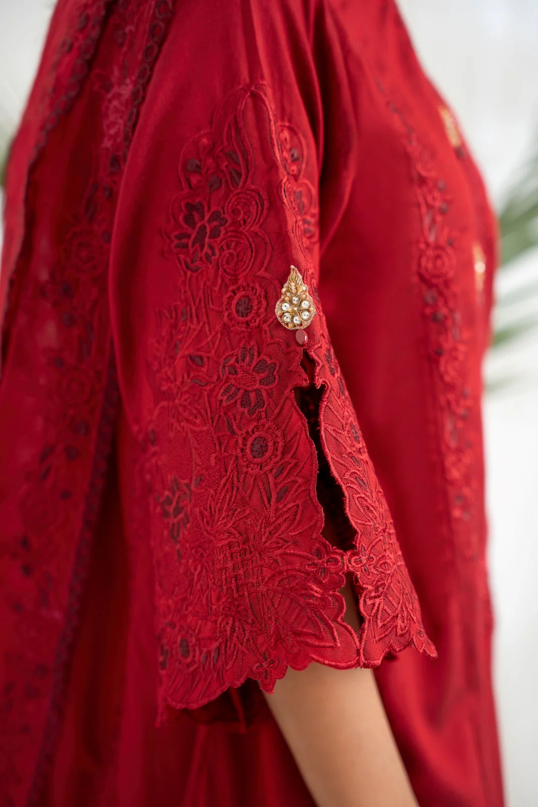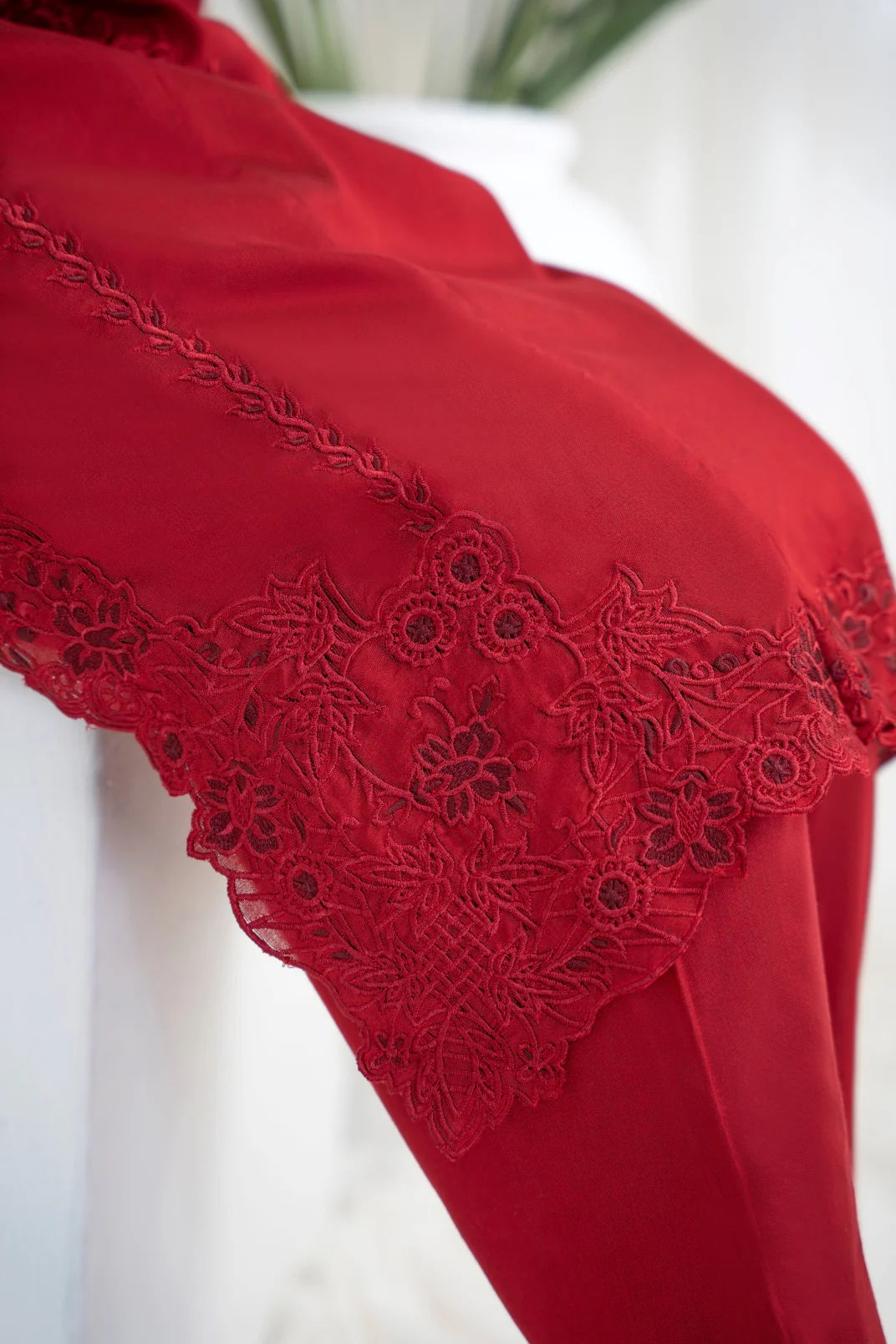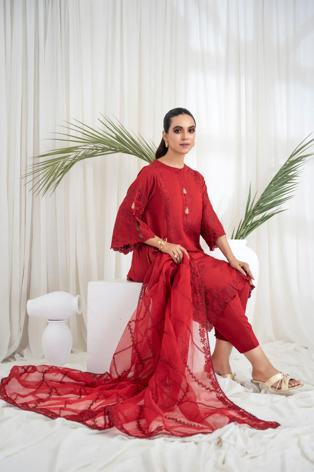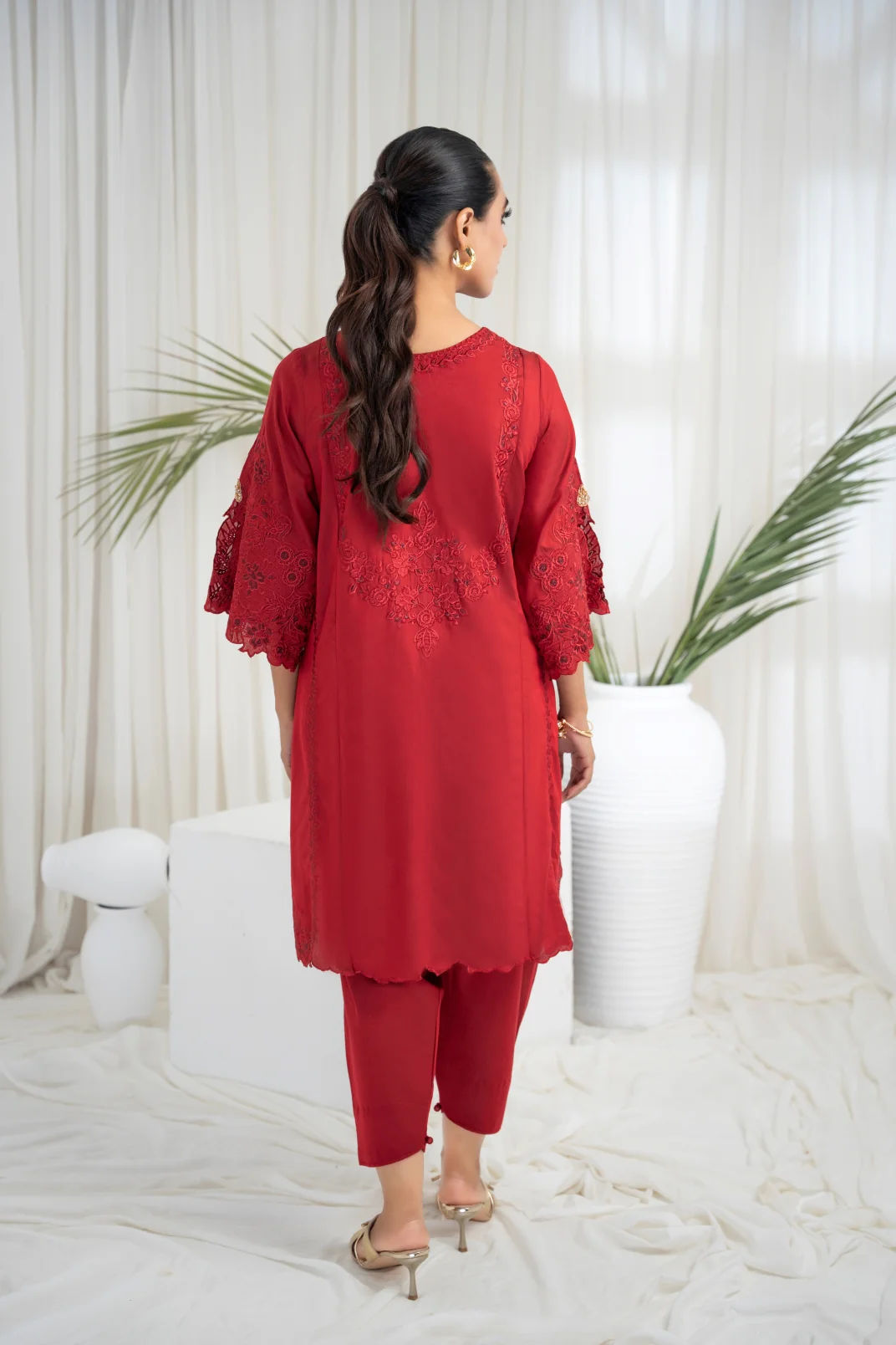 The ensemble features a sindoori red mid-length A-line kattan silk tunic with three-quarter cutwork sleeves. Paired with organza dupatta embellished with cutwork thread embroidery all over. Finished with hand embroidered motifs and stones. Paired up with a matching kattan silk skinny shalwar to create an elegant and timeless look.